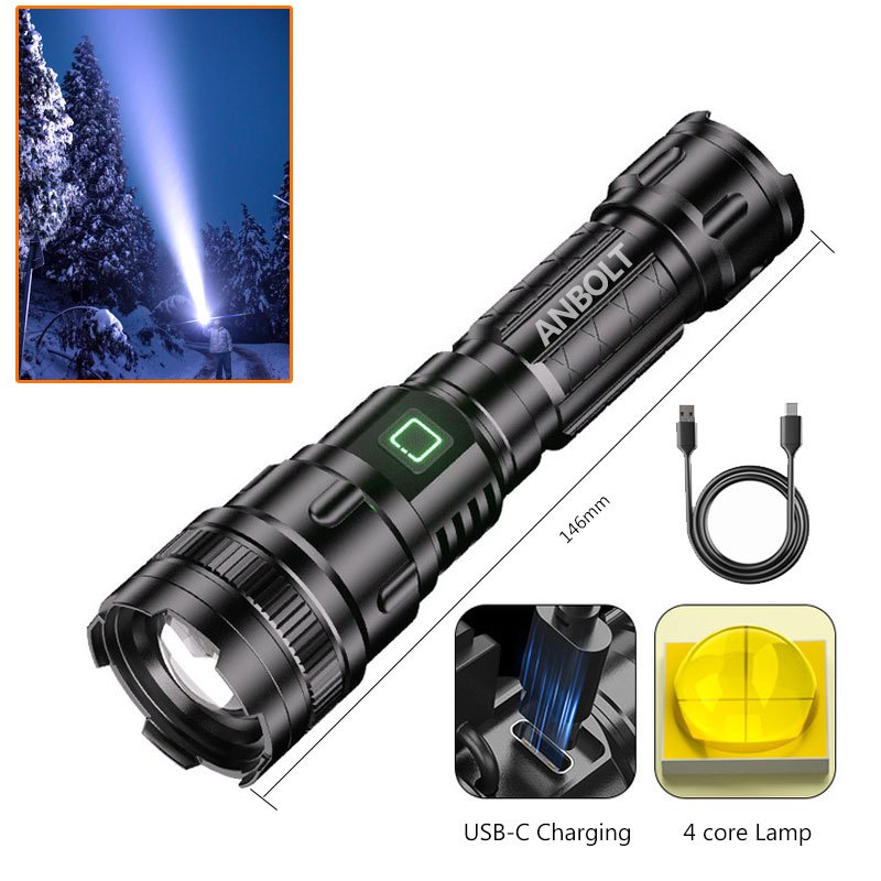 Anbolt Senter LED Super Terang Jarak Jauh Anti Air Senter LED 90000 Lumens Original USB-C Rechargeable Zoom Flashlight with 26650Baterai