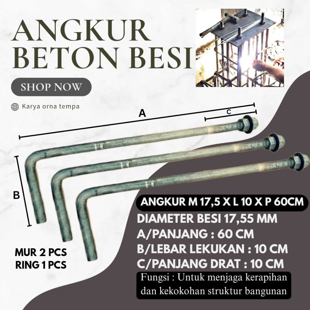 Angkur L Besi beton bubut ukuran diameter besi 17,5 mm panjang 30cm/40cm/50cm/60cm