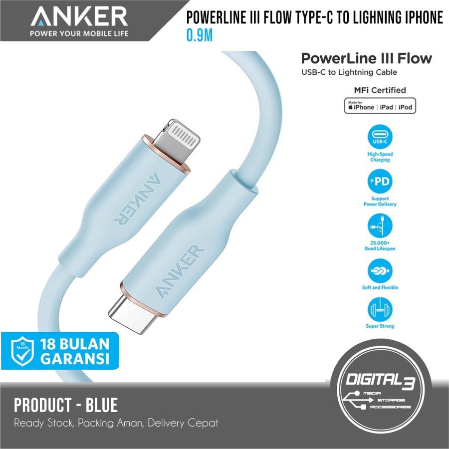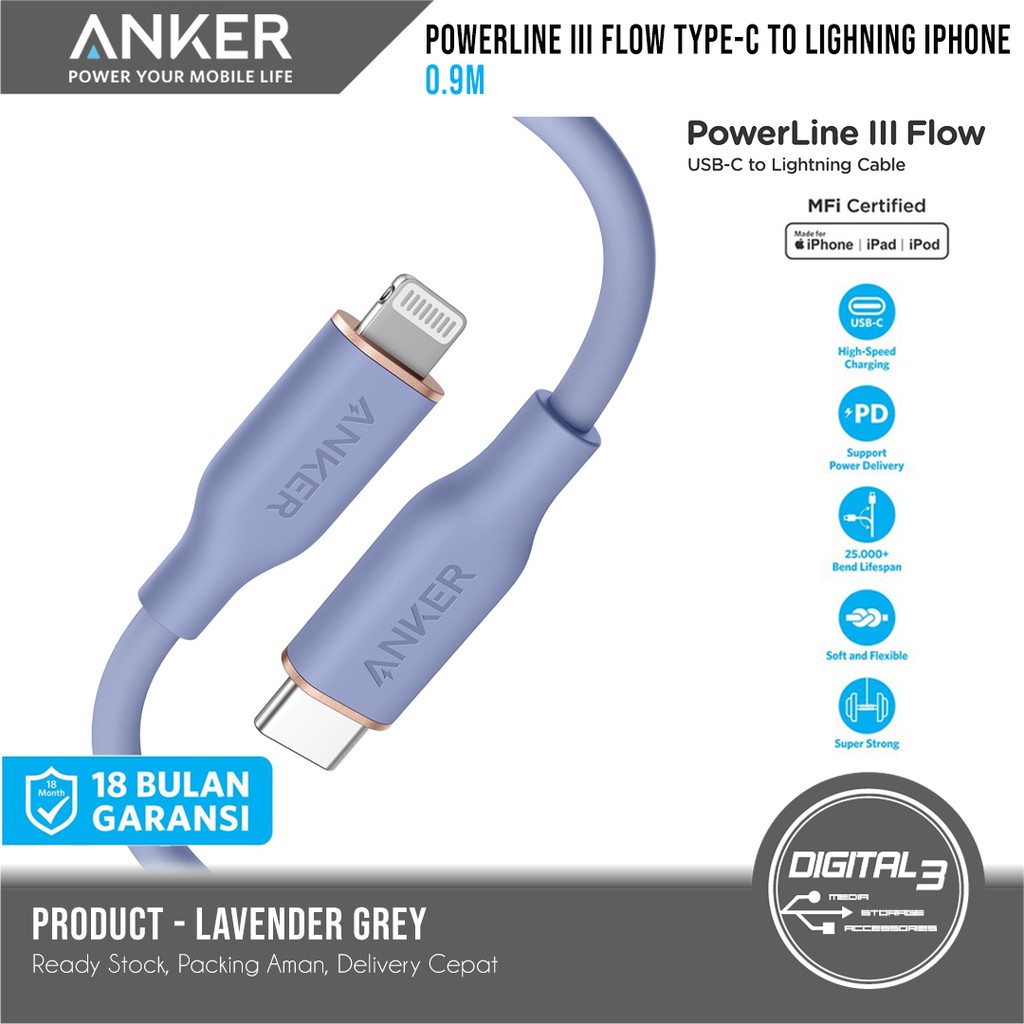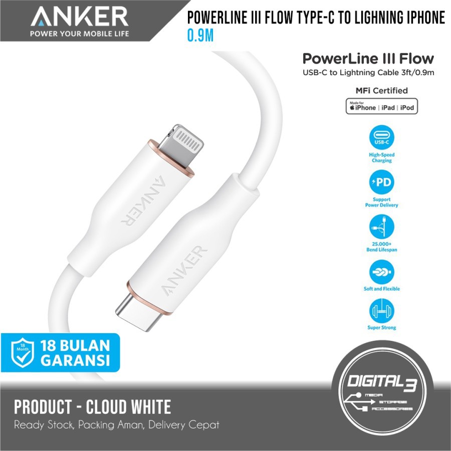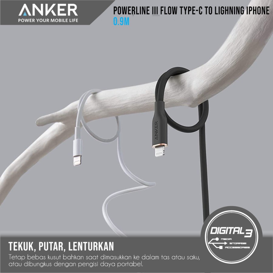 Anker Powerline III Flow Type C to Lightning Cable 0.9M Kabel Iphone 3 feet (A8662)