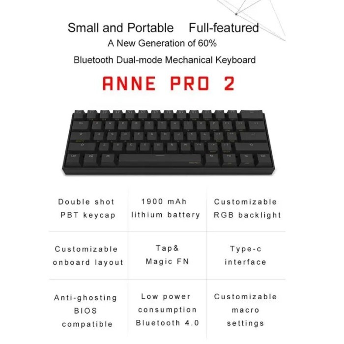 Anne Pro 2 60% Layout Bluetooth Mechanical Keyboard Hot-swappable RGB