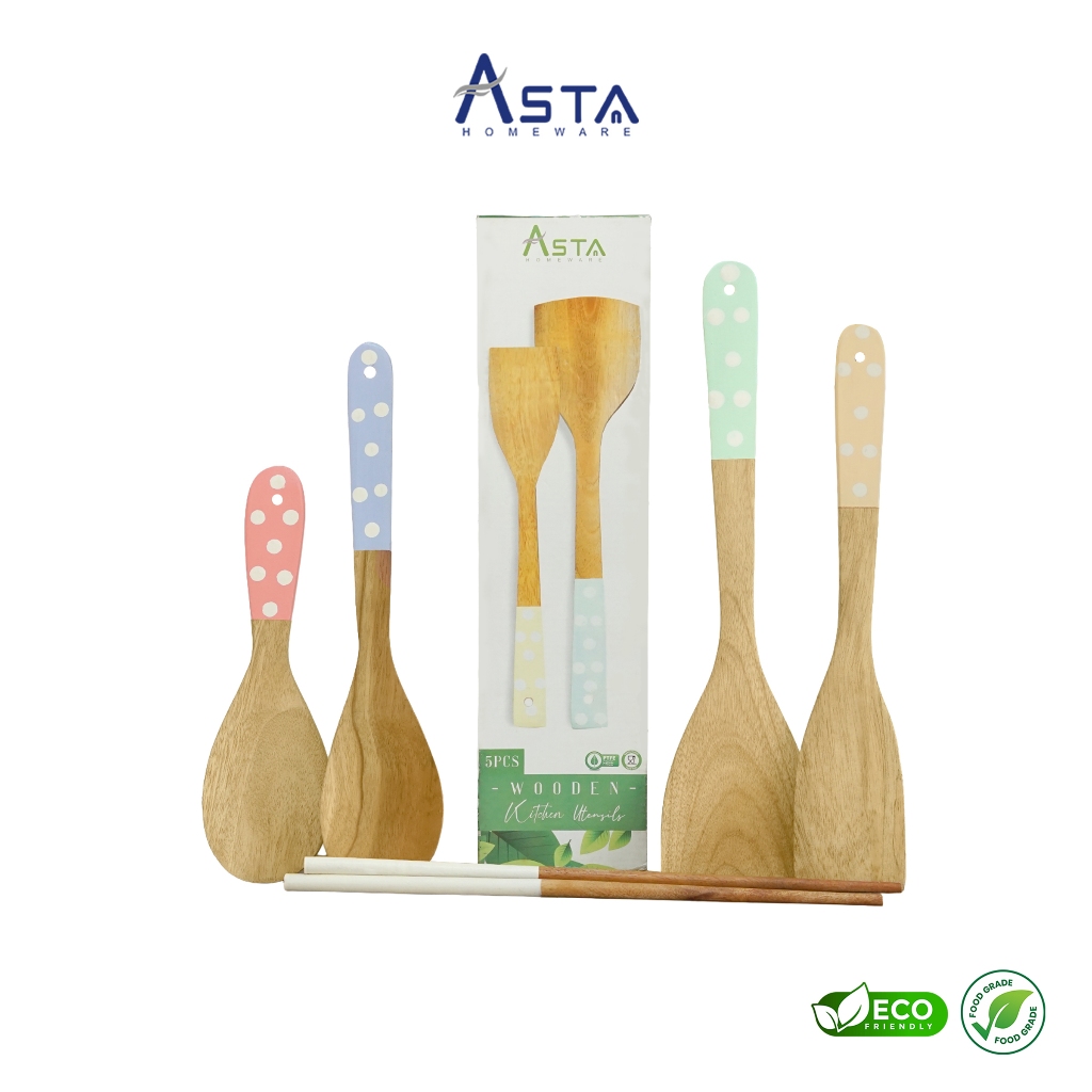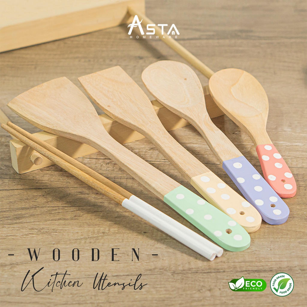 Spatula Kayu - Sutil Masak Centong Nasi Sumpit - Food Grade - Warna Set 5 pcs | Asta Homeware