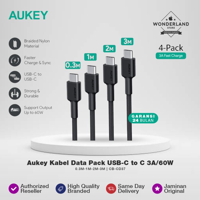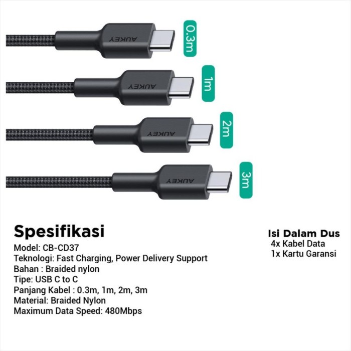 Aukey Kabel Data USB-C to C 3A/60W 30cm/1-2-3M Super Fast CB-CD37