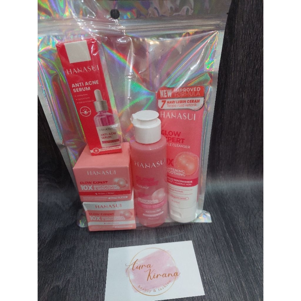 AuraKiranaBeauty Paket HANASUI 5in1 Lengkap Spesial (FREE POUCH/HADIAH TAS RANDOM) Paket Hanasui Glow Expert Improved Formula + Serum Vit C | Collagen | Gold | Acne | Men | Bright Expert ORI BPOM