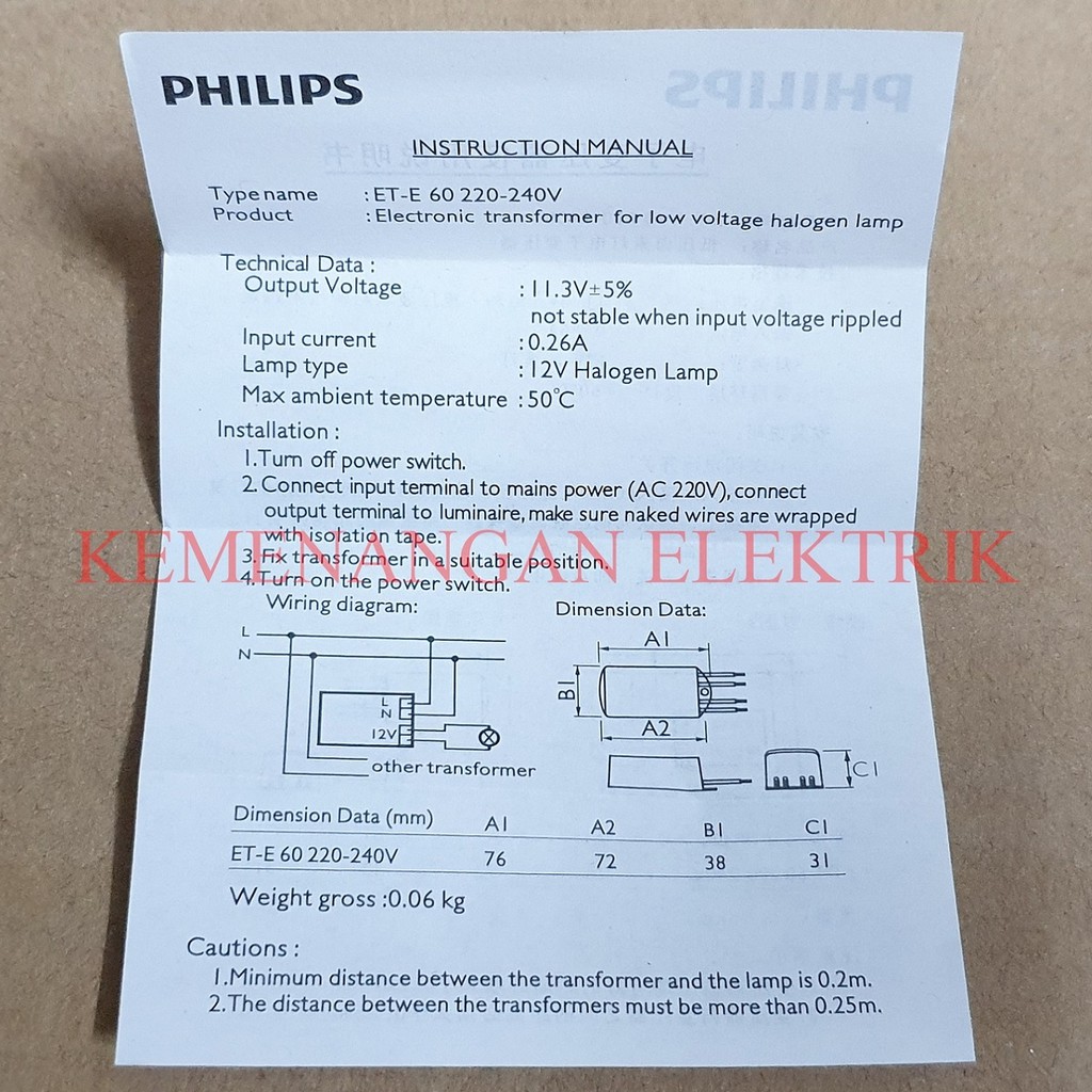 BALLAST TRAFO HALOGEN ETE 60 ETE60 PHILIPS / TRAFO LAMPU HALOGEN ET-E 60 PHILIPS MR16