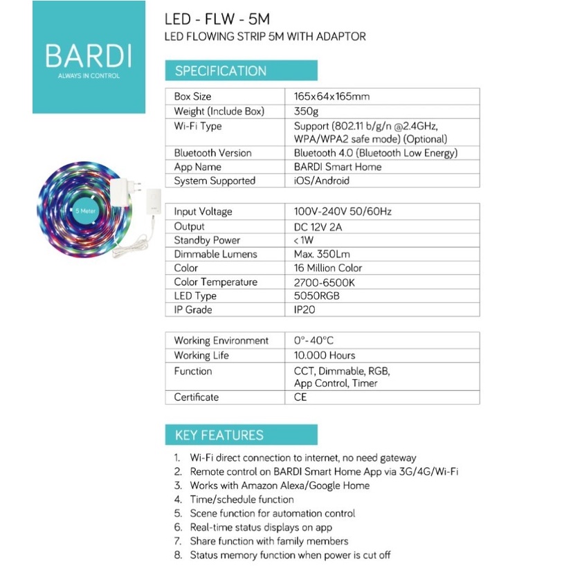 BARDI LED Flowing Strip 5M With Adaptor Lampu Hias RGBWW Wifi