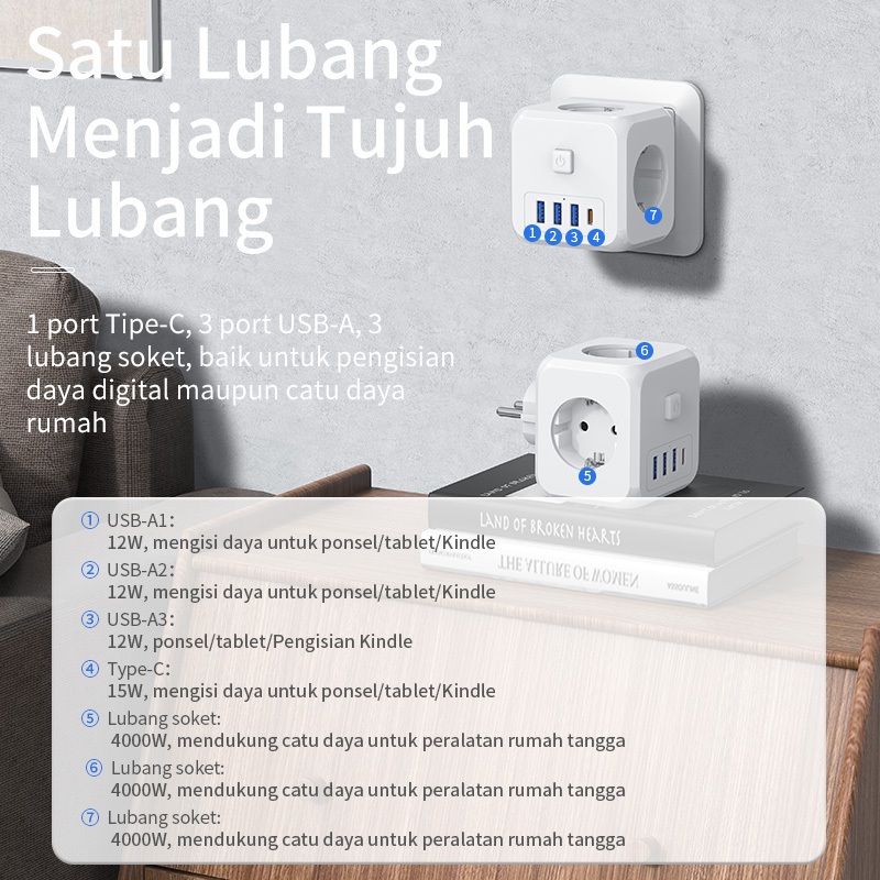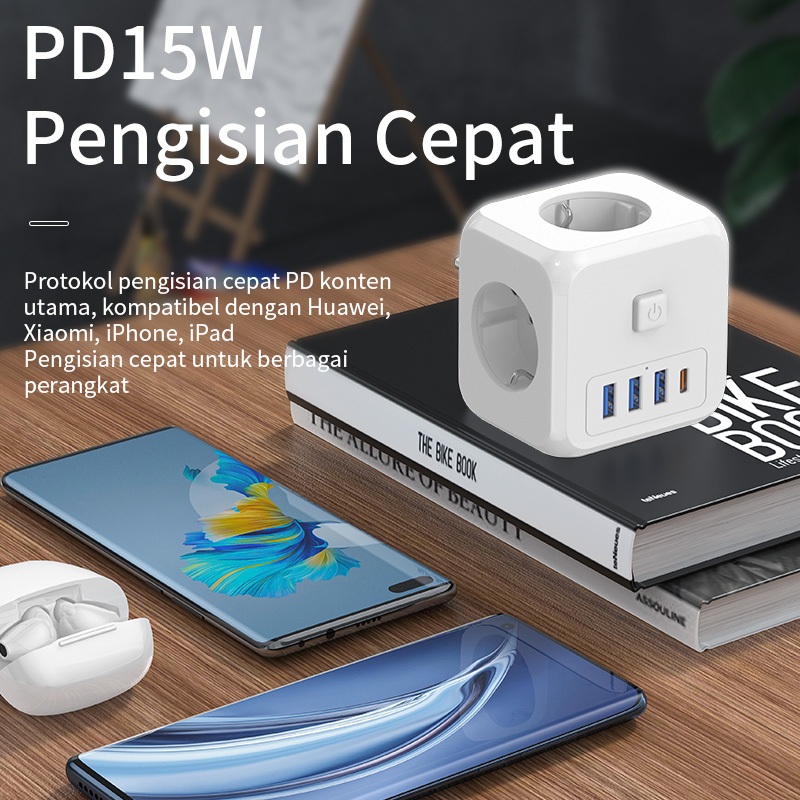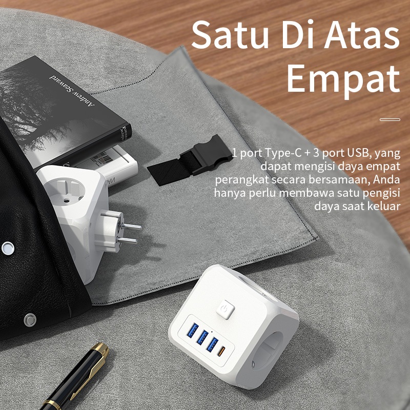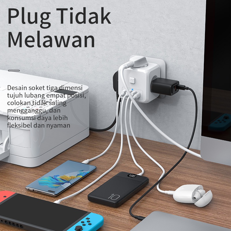 BASIKE Stop Kontak 3 Lubang 7-in-1 Colokan Listrik Kubus USB+Type C Fast Charging Sambungan Kabel
