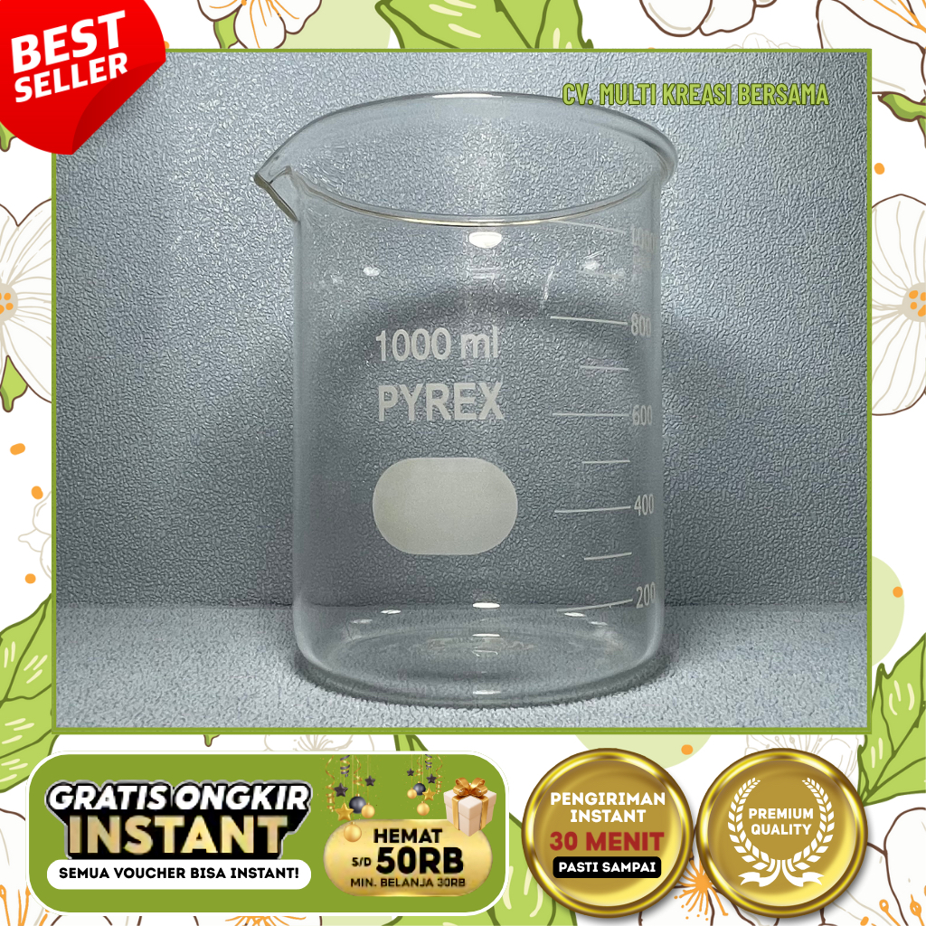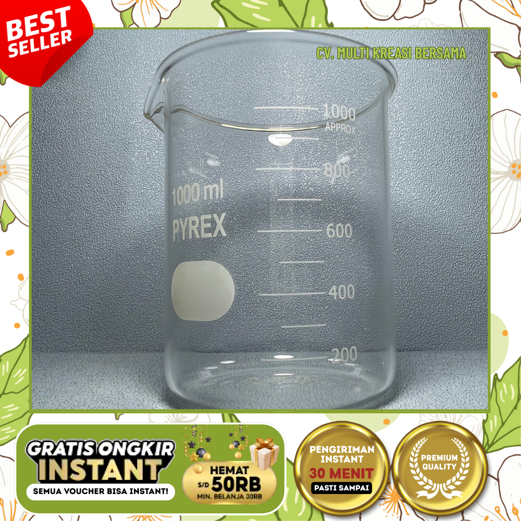 BEAKER GLASS 1000 ML PYREX / BEAKER GLASS 1 LITER PYREX / MEASURING BEAKER PYREX / BOROSILICATE GLASS / BEAKER BOROSILIKAT / GELAS LABORATURIUM / GELAS BEAKER BAHAN KACA MEREK PYREX