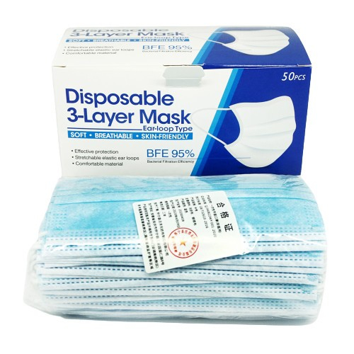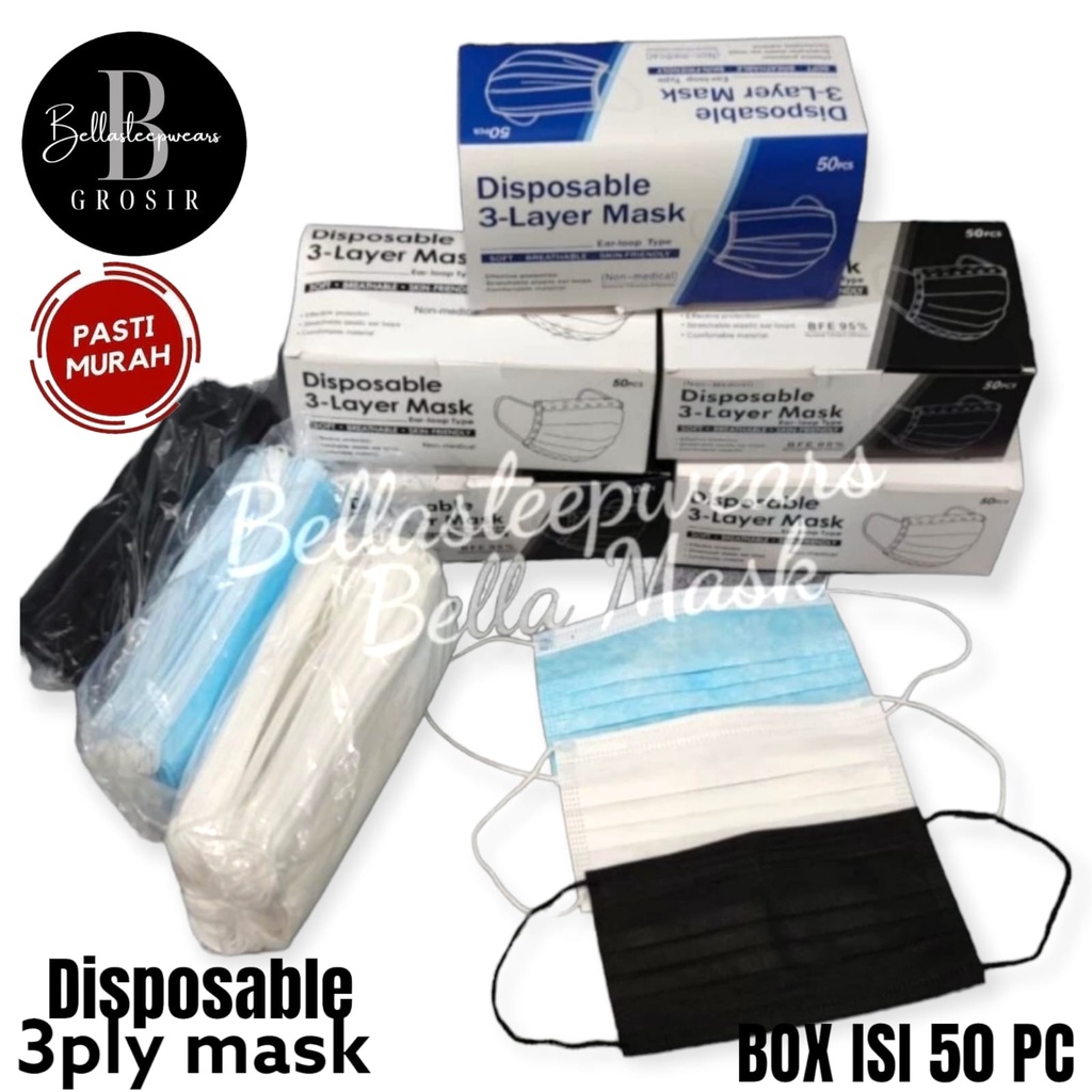 BELLA - DISPO - MASKER 3PLY DISPOSABLE FACE MASK EARLOOP HIJAB IMPORT ISI 50pc - BIRU HITAM PUTIH
