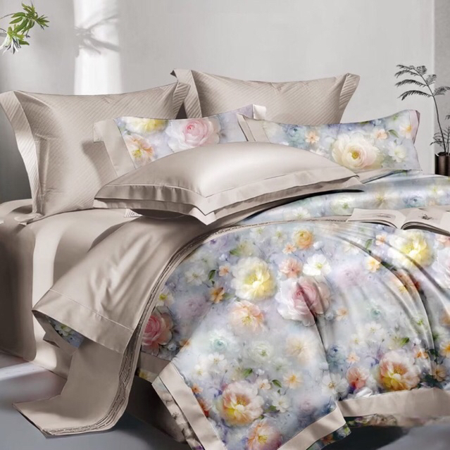 BIOSIBEDDING Sprei Katun Jepang Motif Bunga Abu Krem Kuning Mint - Sprei Custom Size Murah Surabaya - Sprei Jepang Surabaya