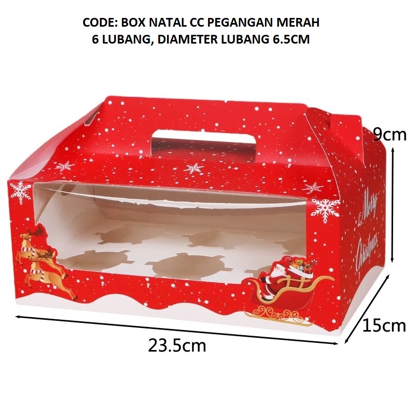 BOX CUPCAKE NATAL BIRTHDAY ULANG TAHUN 6lubang Box Muffin Box Kue Ulang Tahun Packaging Kue Box Mika Kue (BOX CC PEGANGAN MERAH)