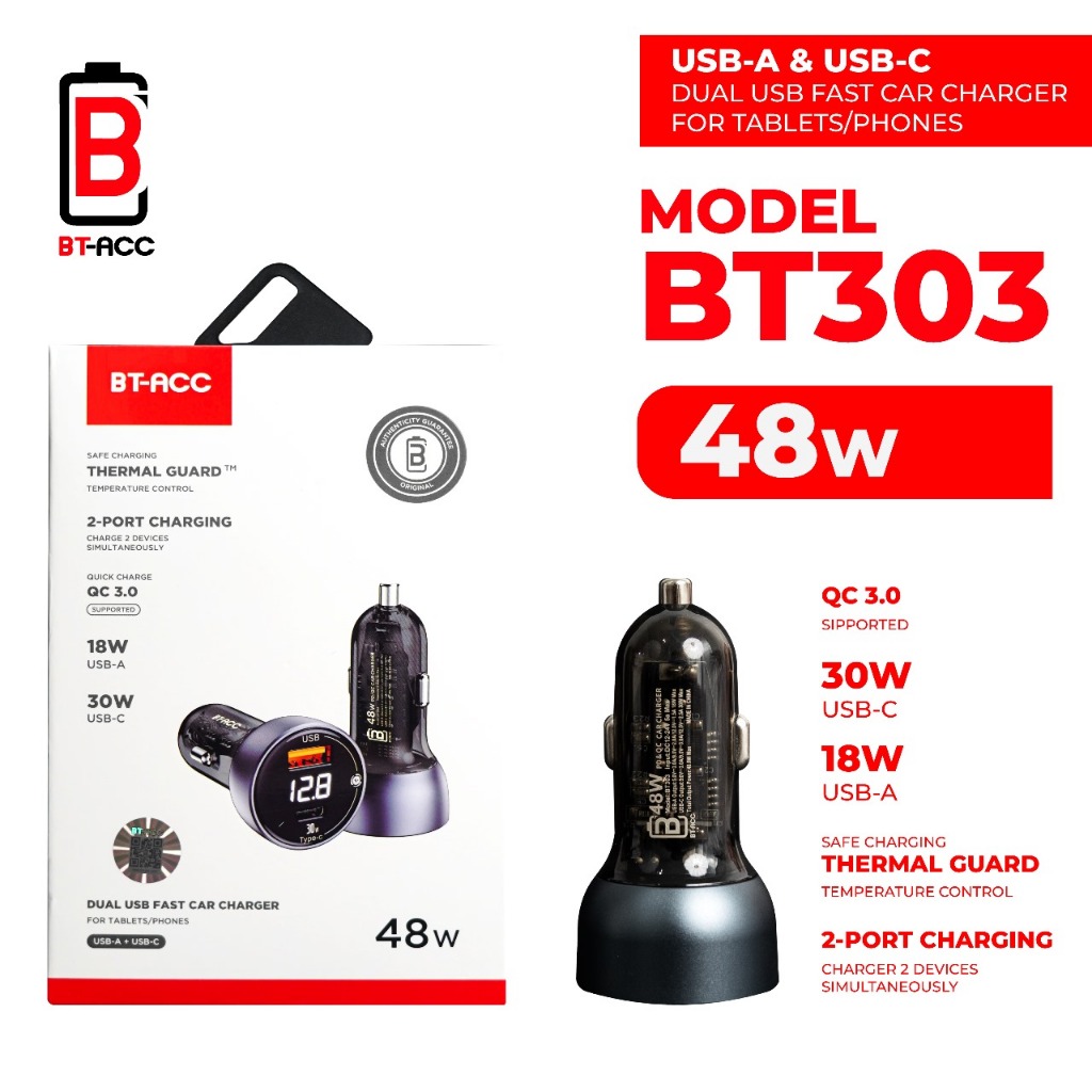 BT-ACC BT303 Adaptor Charger Mobil 48W Dual USB (USB-A dan USB-C) Fast Charging