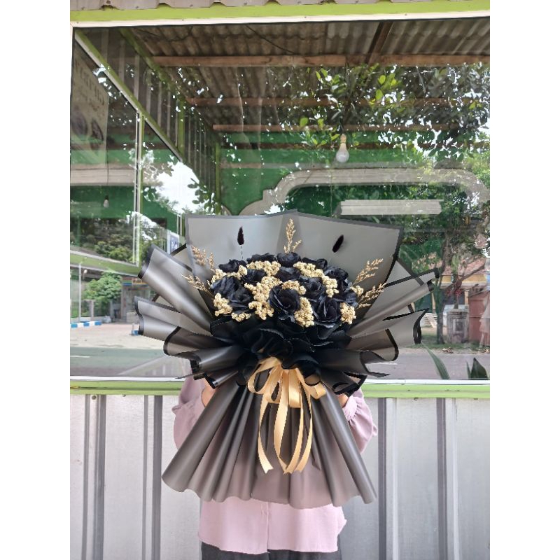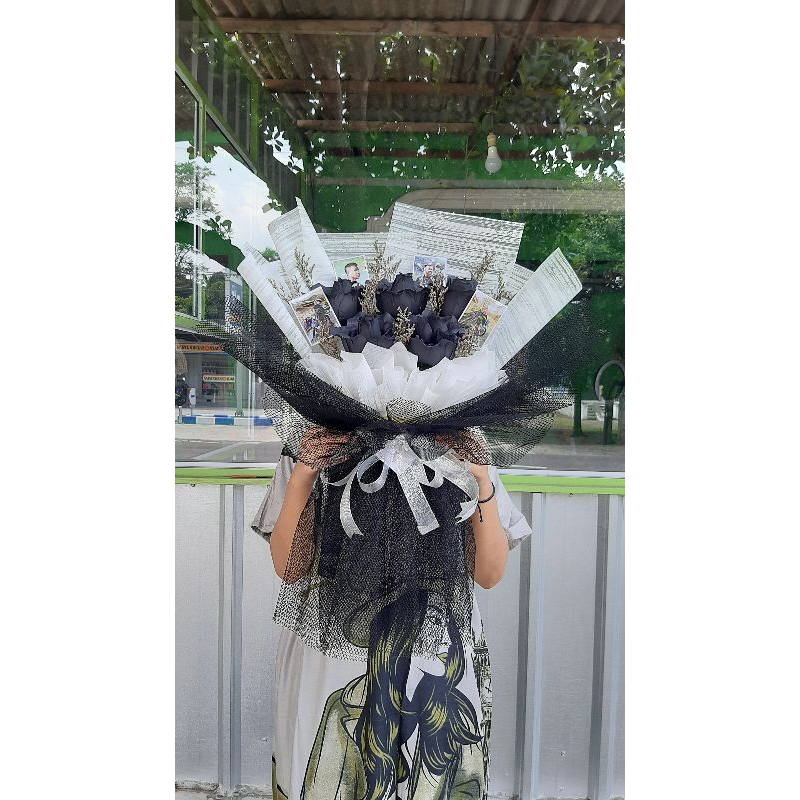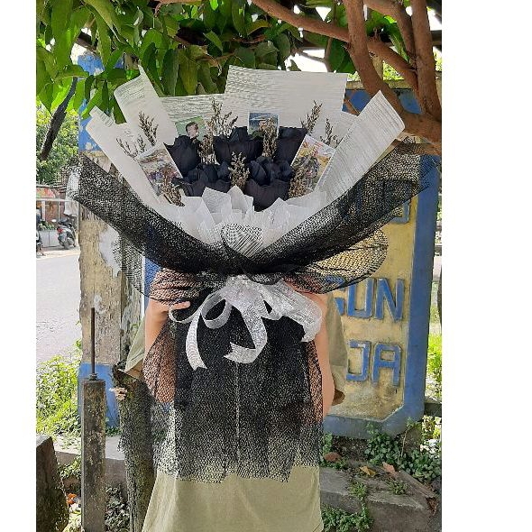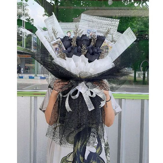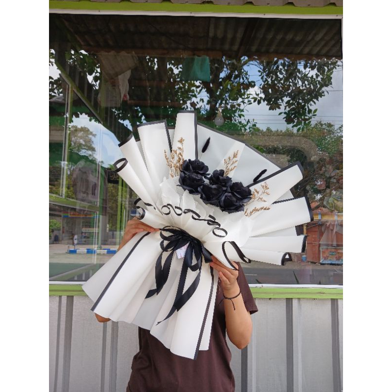 BUKET MAWAR HITAM (FREE PACKING RP 10K) WRAP PUTIH MIX JARING HITAM BUKET WISUDA BUKET MURAH BUKET SIDANG BUKET ULTAH