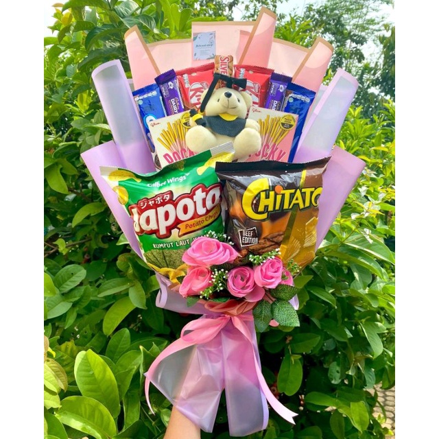 BUKET SNACK POCKY CHIKI BONEKA WISUDA KERTAS CELLOPHANE / BUKET SNACK MEWAH / BUKET SNACK MENARIK / BUKET SNACK HADIAH WISUDA / HADIAH SIDANG / WEDDING / ANNIVERSARY / HADIAH PACAR / JAJANAN / BINGKISAN / SIDANG SKRIPSI /