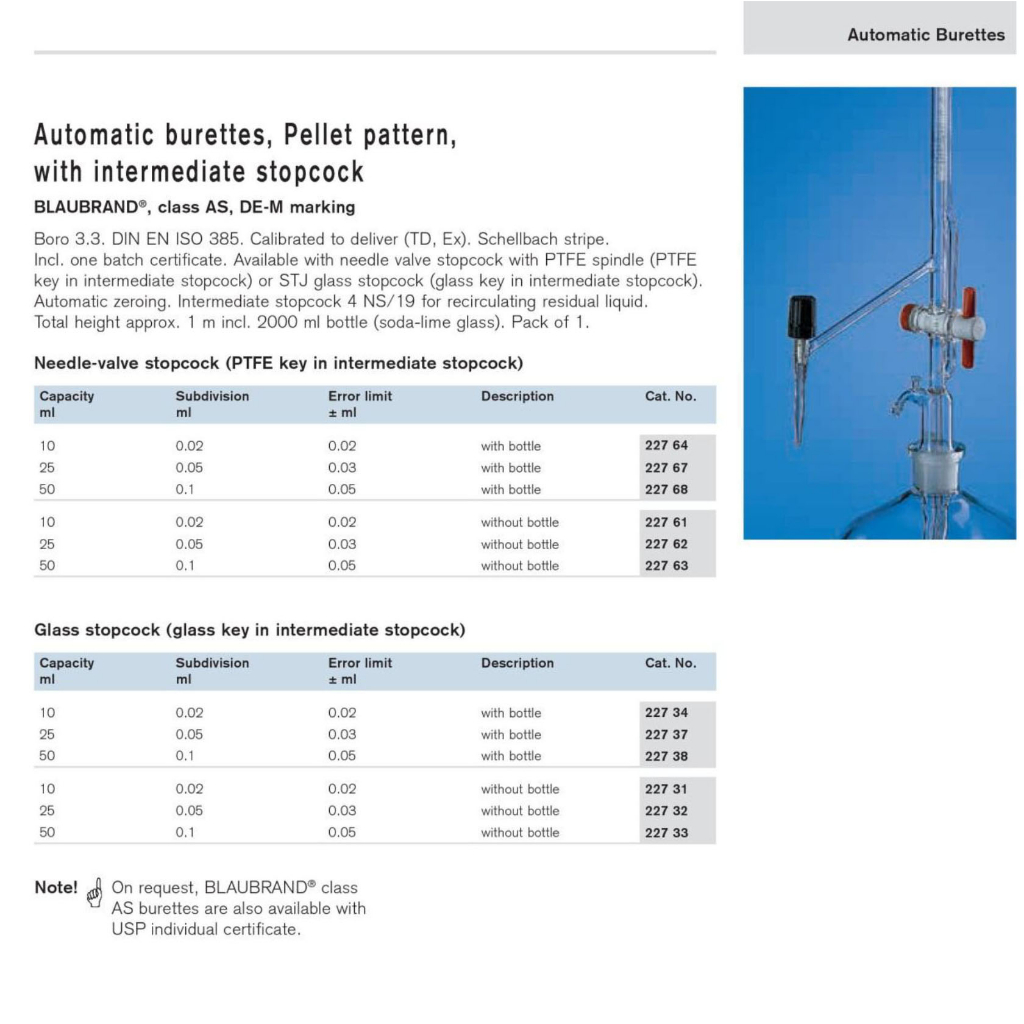 BURET AUTOMATIC 25ml without Bottle 2000mL Glass Key Pallet Partten. BRAND