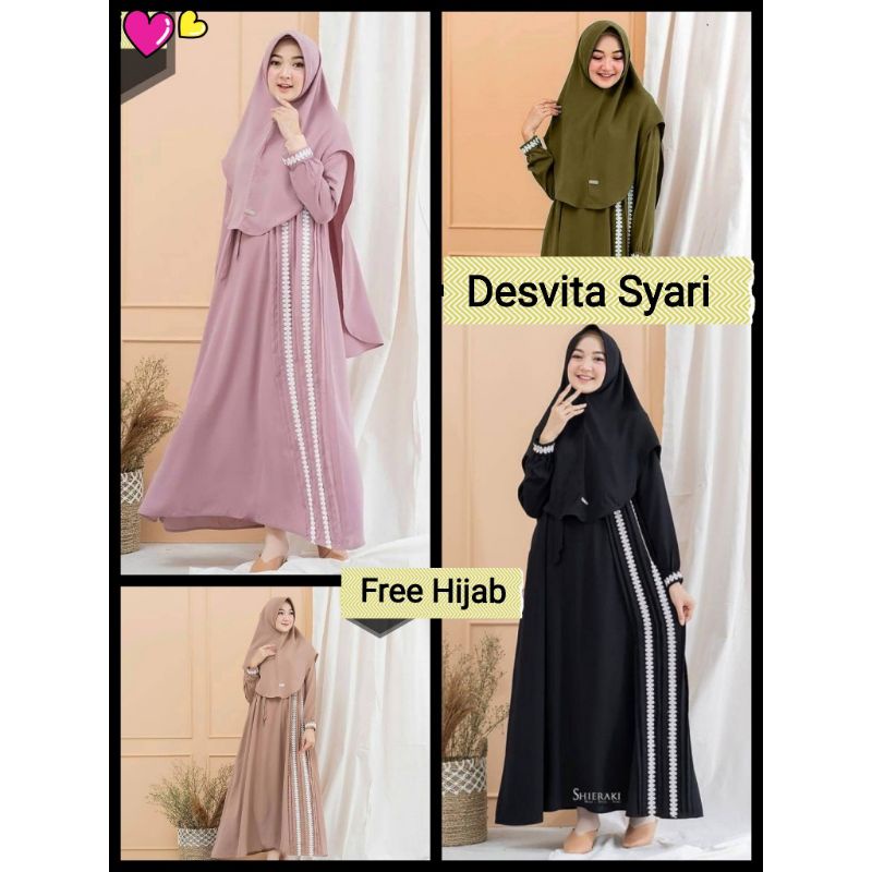 Baju Gamis Dress Busui Wanita Syari Muslim Free Plus Khimar Hijab Jilbab DESVITA SYARI Warna Polos Hitam Black