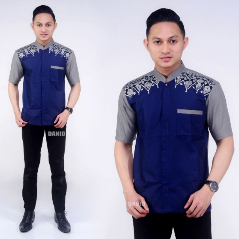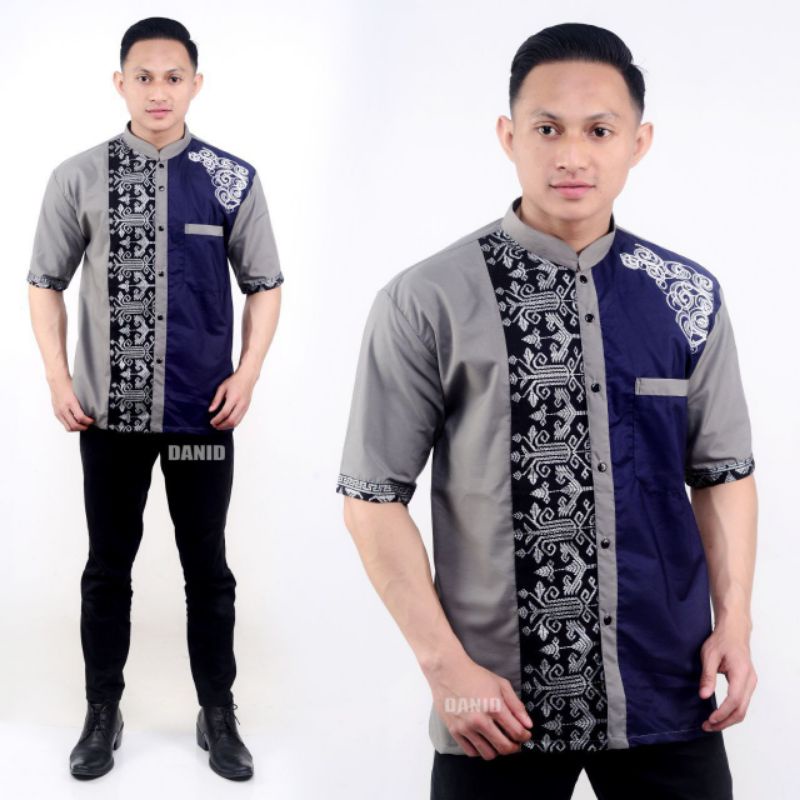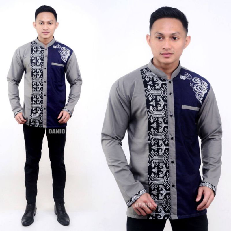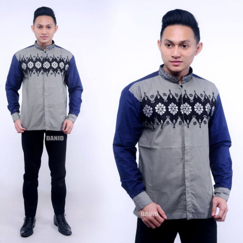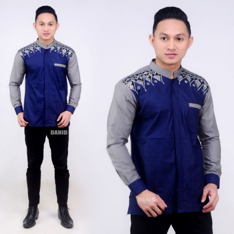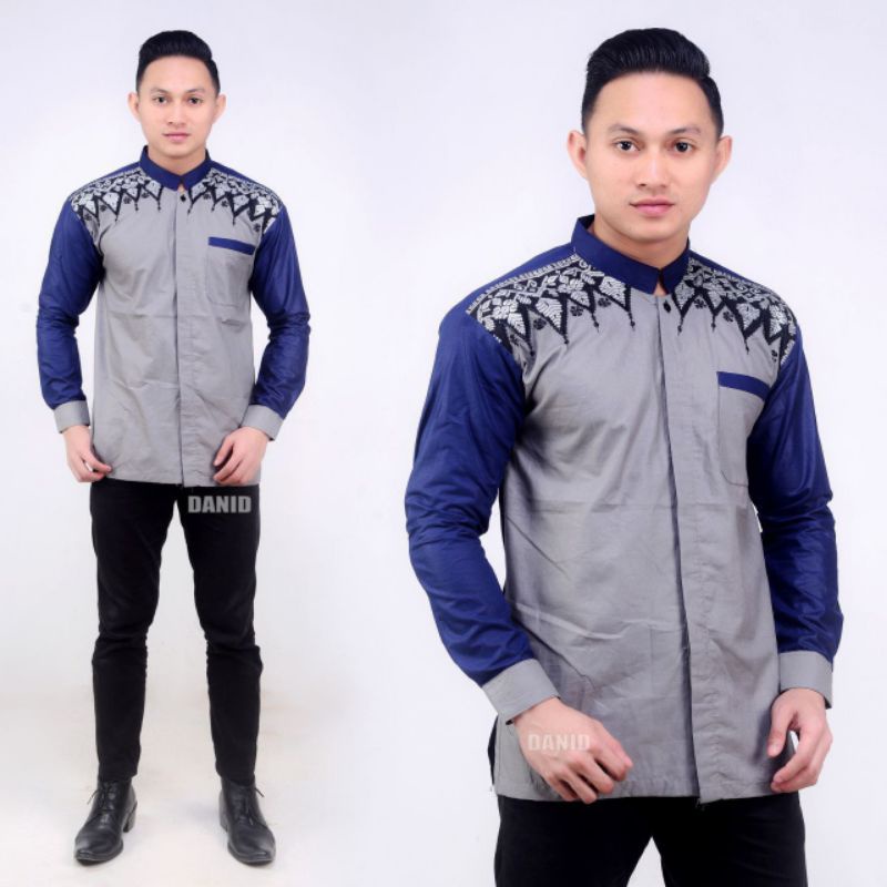 Baju Koko Pria Panjang Exclusive Warna Abu Abu Kombinasi Warna Biru Tua / Biru Dongker / Biru Navy, Navi Model Bordir Ukuran M L XL XXL