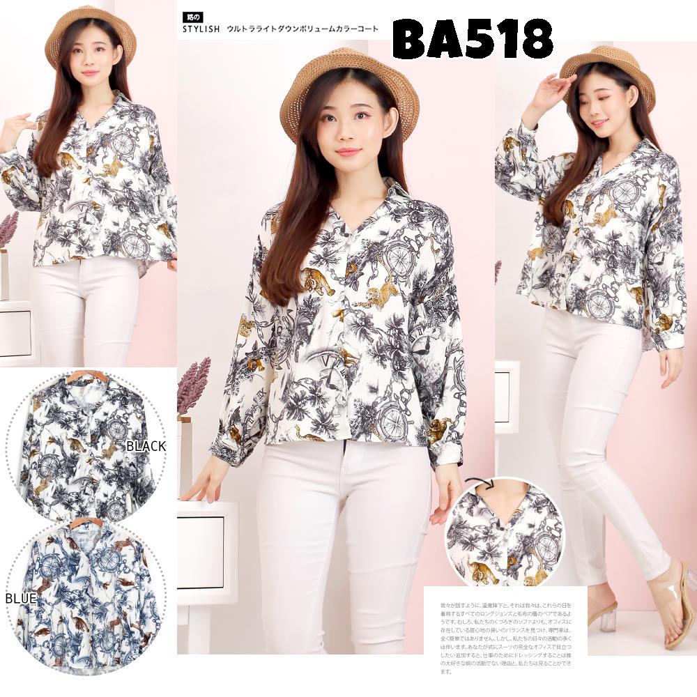 Baju atasan blouse motif bunga lengan panjang kembang kerja kantoran casual fashion cewek wanita murah -518