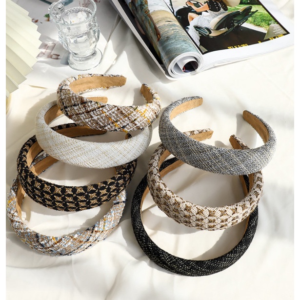 Bando Poni Korea Polos Wanita Motif Tweed Hitam Putih Gold Lory