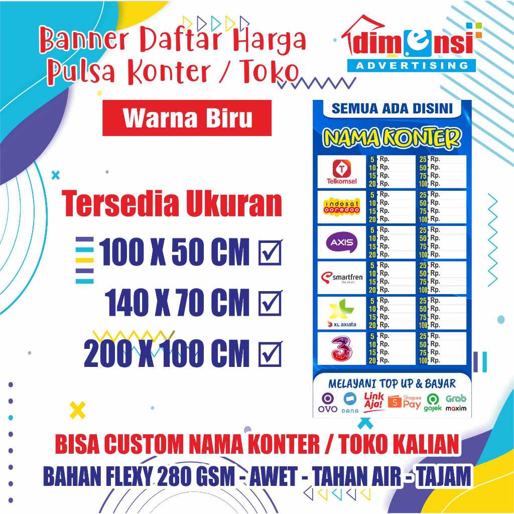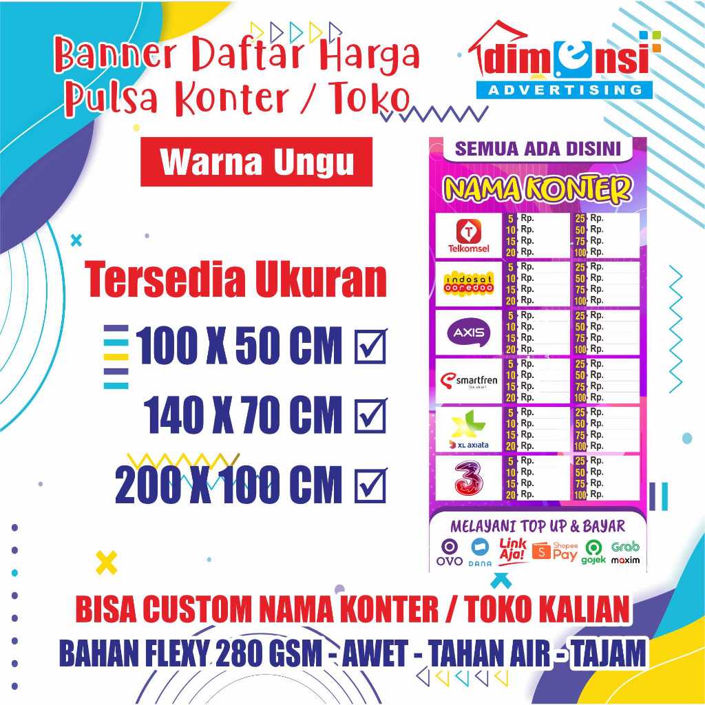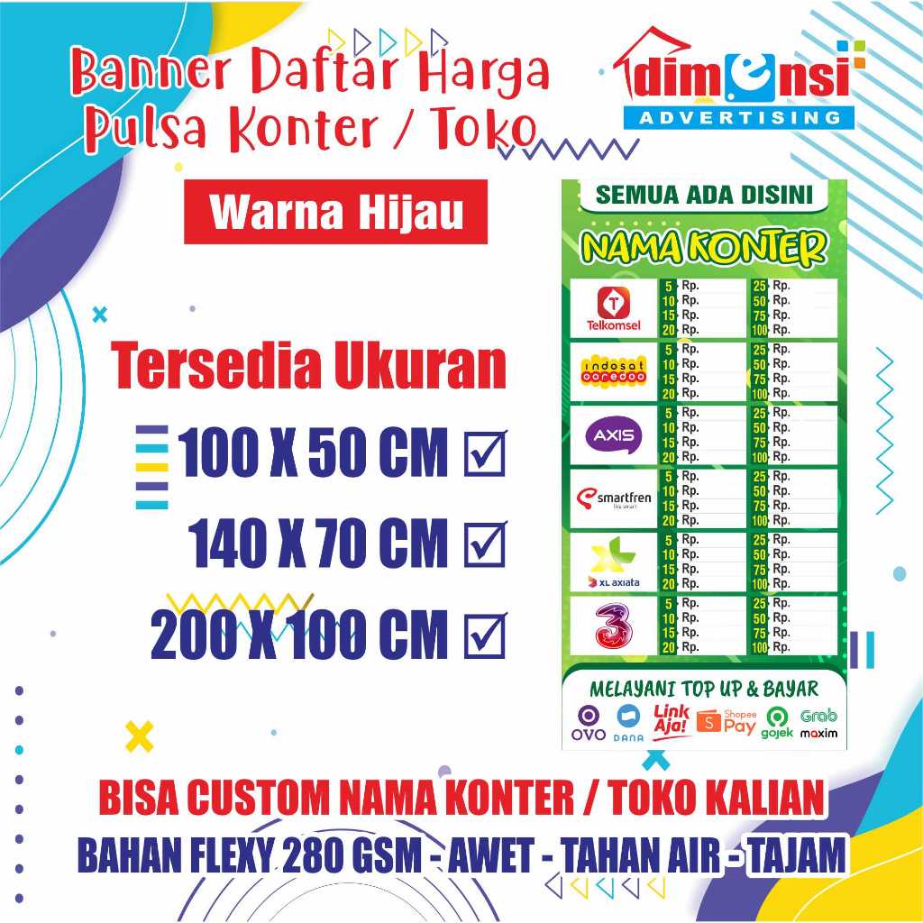 Banner Harga Pulsa Konter / Spanduk Daftar Harga Pulsa / Banner Warung Pulsa - DIMENSI ADV