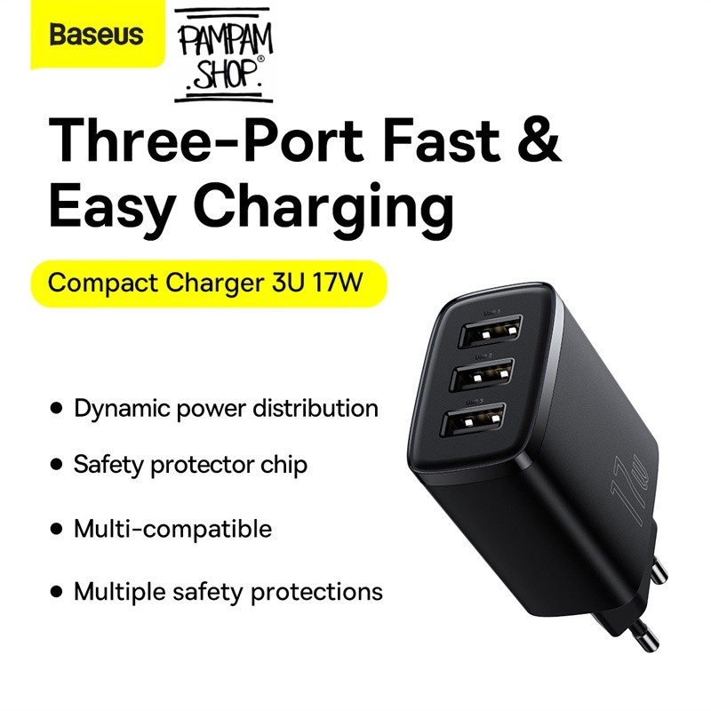 Baseus Original Adaptor Charger Compact 17W 3.4A 3 USB Port Kepala Adapter Casan Tiga Lobang Ori