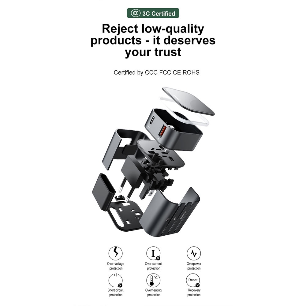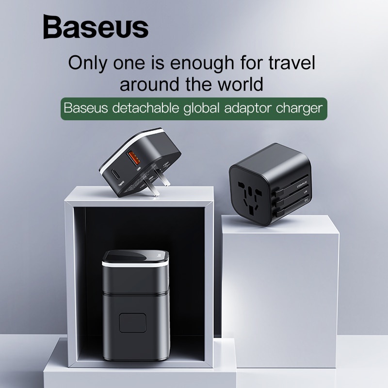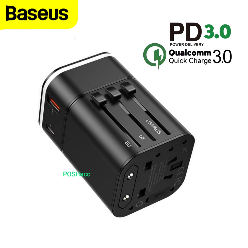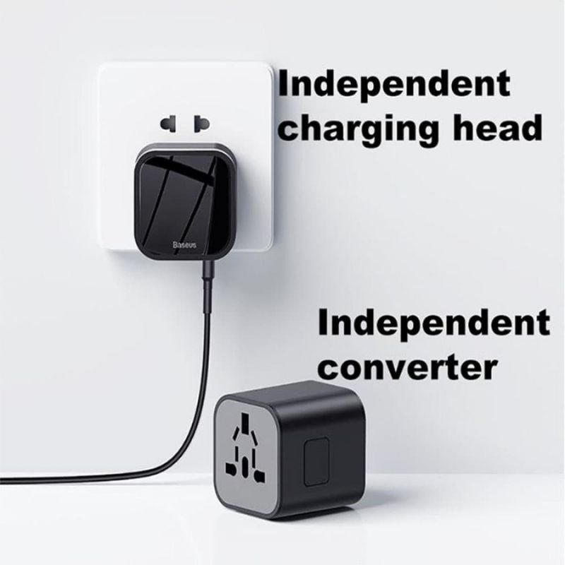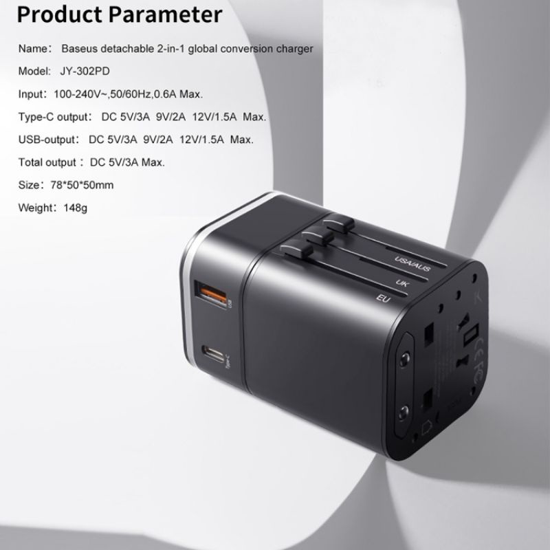 Baseus Removable 2in1 Global Convension Charger 18W PD 3.0 QC 3.0 with USB + Type-C Adaptor EU UK USA AUS Universal Travel Charger Adapter JY-302PD Black Original/ Baseus Cafule Kabel Type-C to Type-C PD 60W