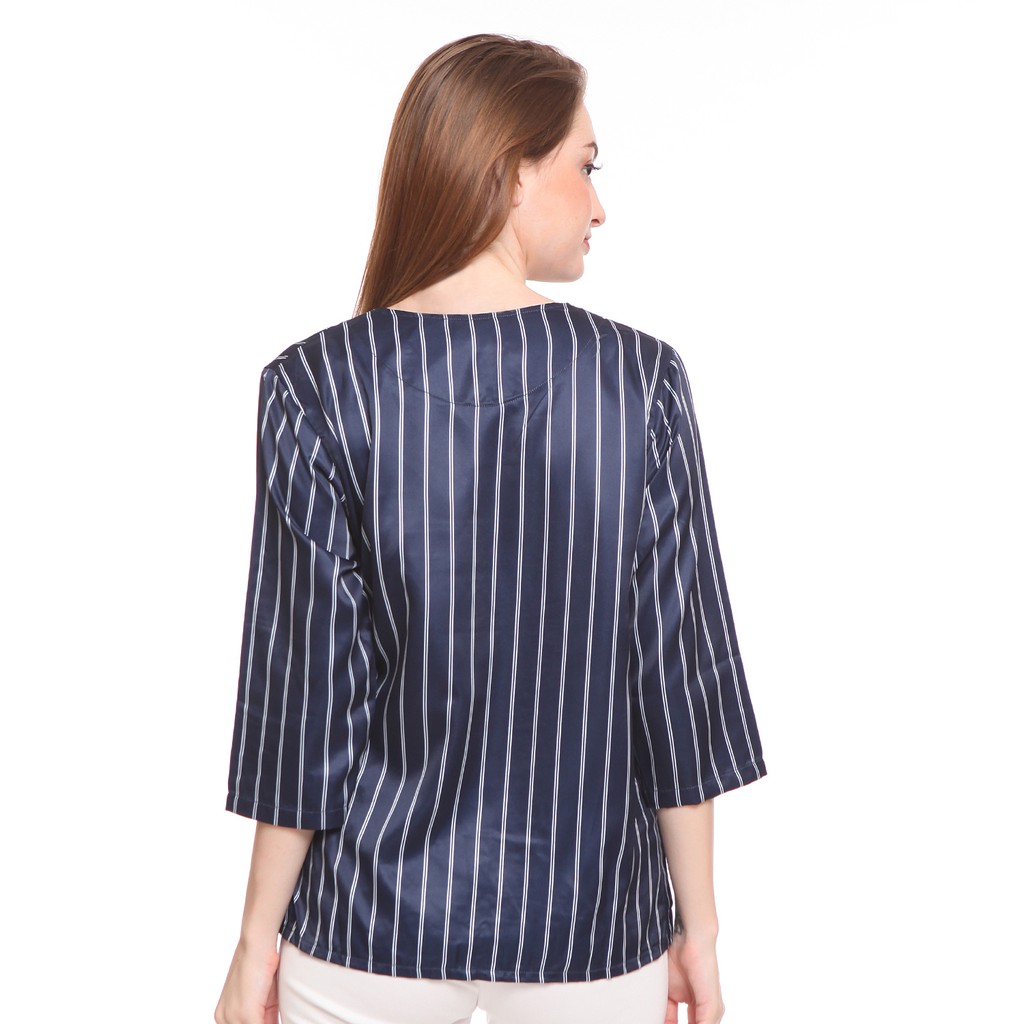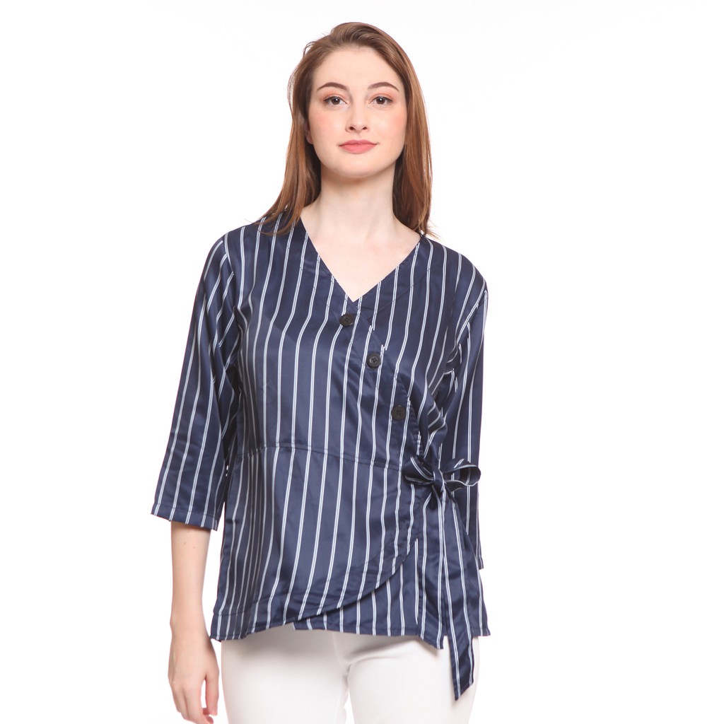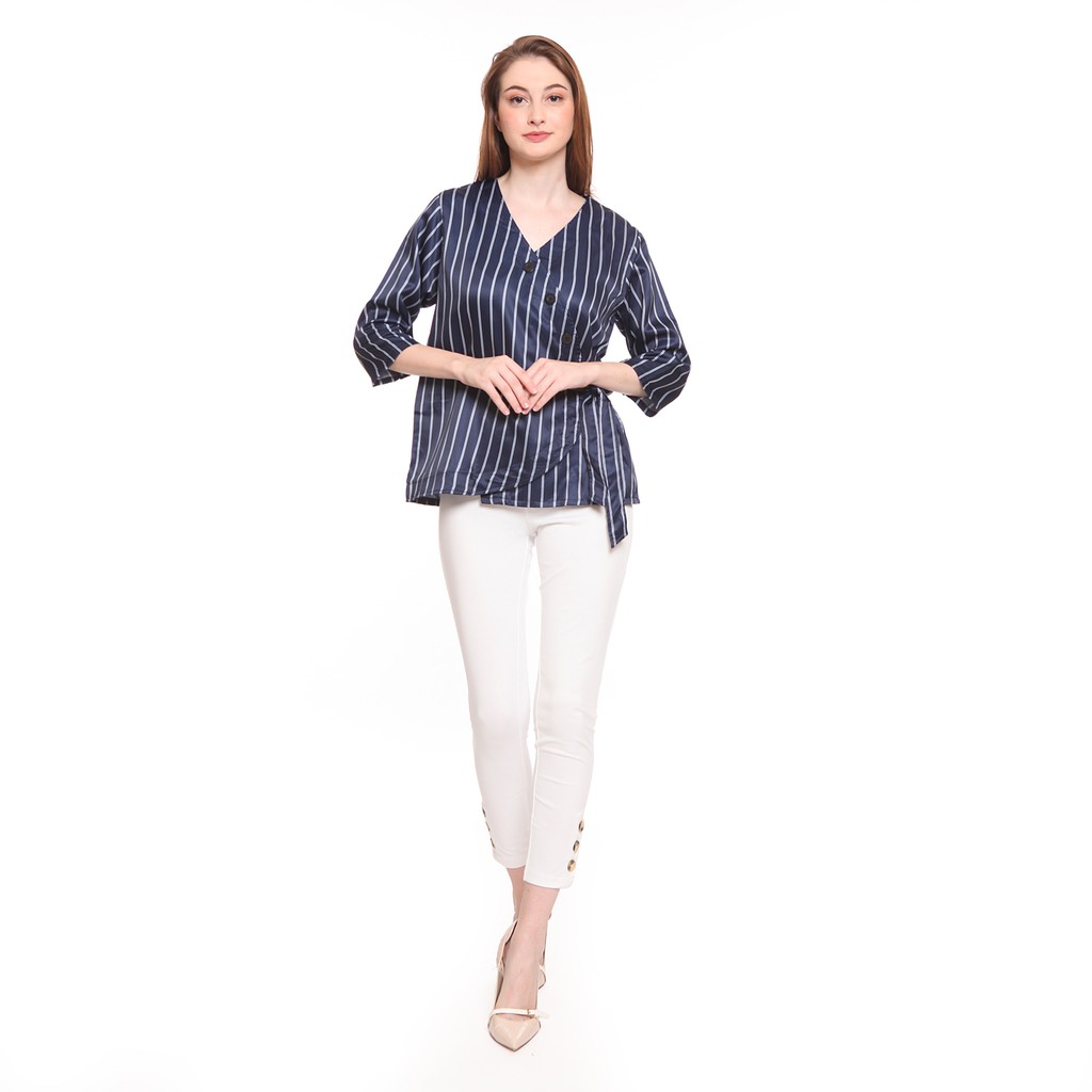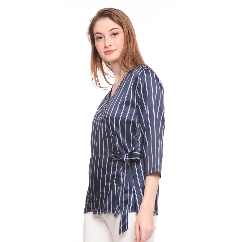 Basix - Louise Ruched Wrap Blouse Blue - Atasan Satin Salur Biru Navy