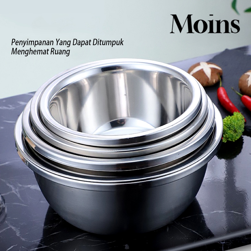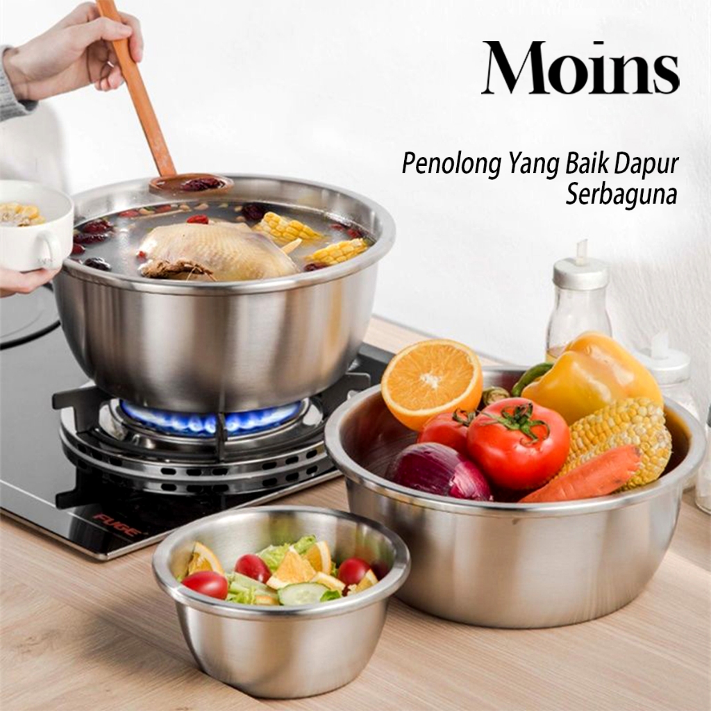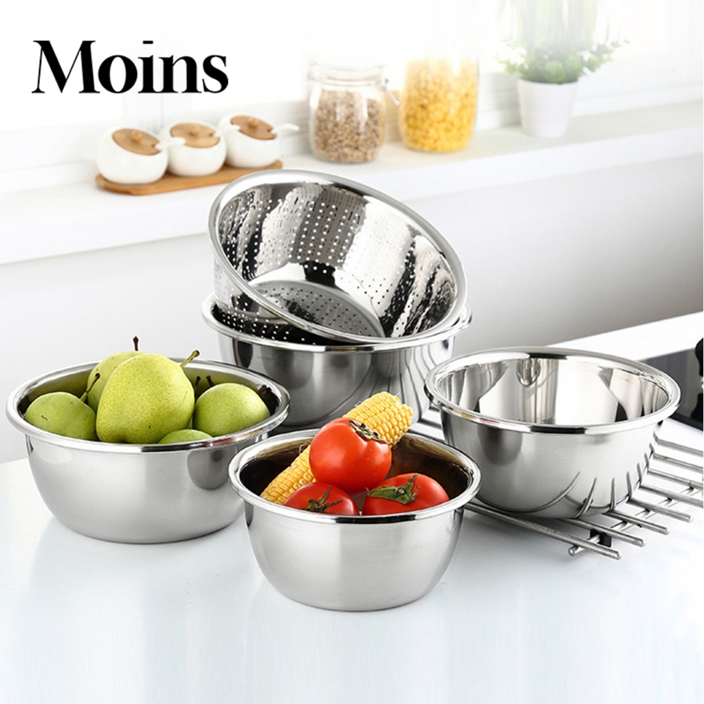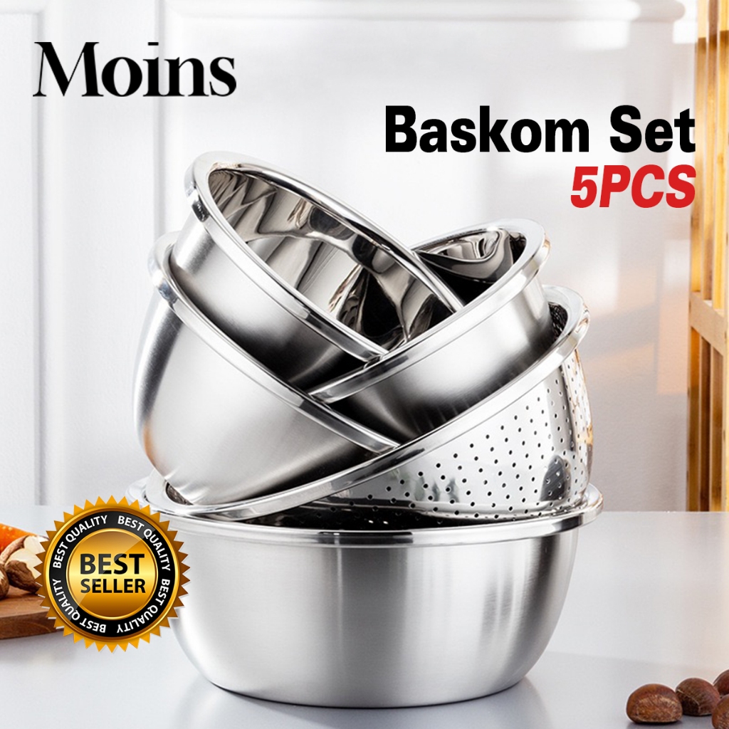 Baskom Set 5 PCS Stainless Steel Tebal Dapur Wadah Cuci Beras Buah Sayur Baskom Dapur Bakul Saringan