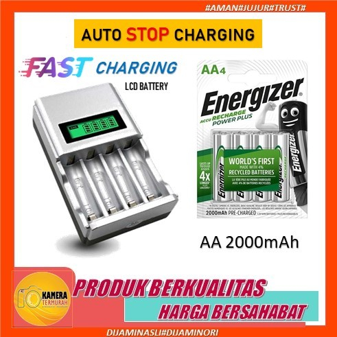 Baterai A2 Energizer Accu Recharge Power Plus Battery AA 2000mAh Bp4 + Quck Charger With LCD