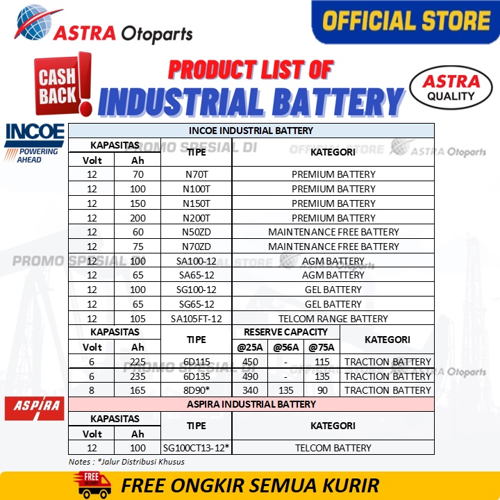 Baterai / Aki INCOE PREMIUM 70 Ah - 12 Volt, Deep Cycle Battery/Accu - untuk Solar Panel Off Grid (tenaga surya), Power Supply (UPS, Sound Audio Amplifier) dll (Industrial Battery INPR-N70T)