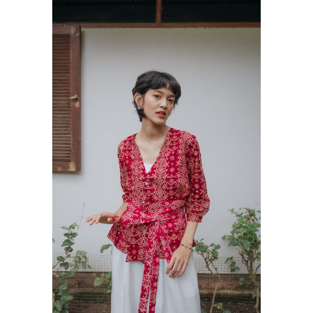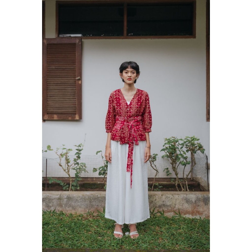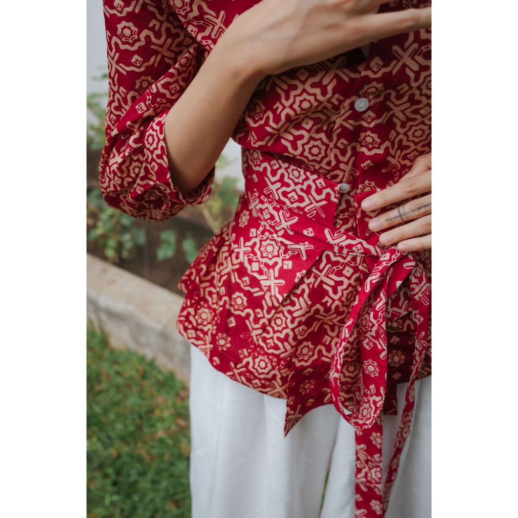 Batik Fractal Helia Blouse Obi Belt Wanita Lengan Pendek