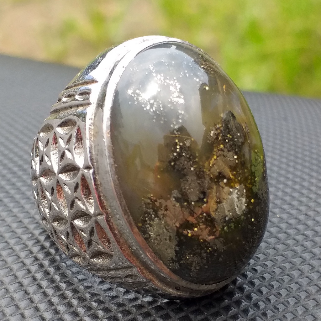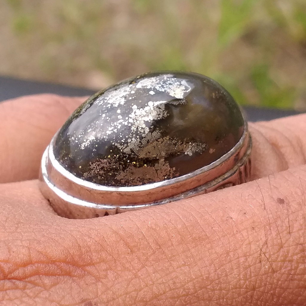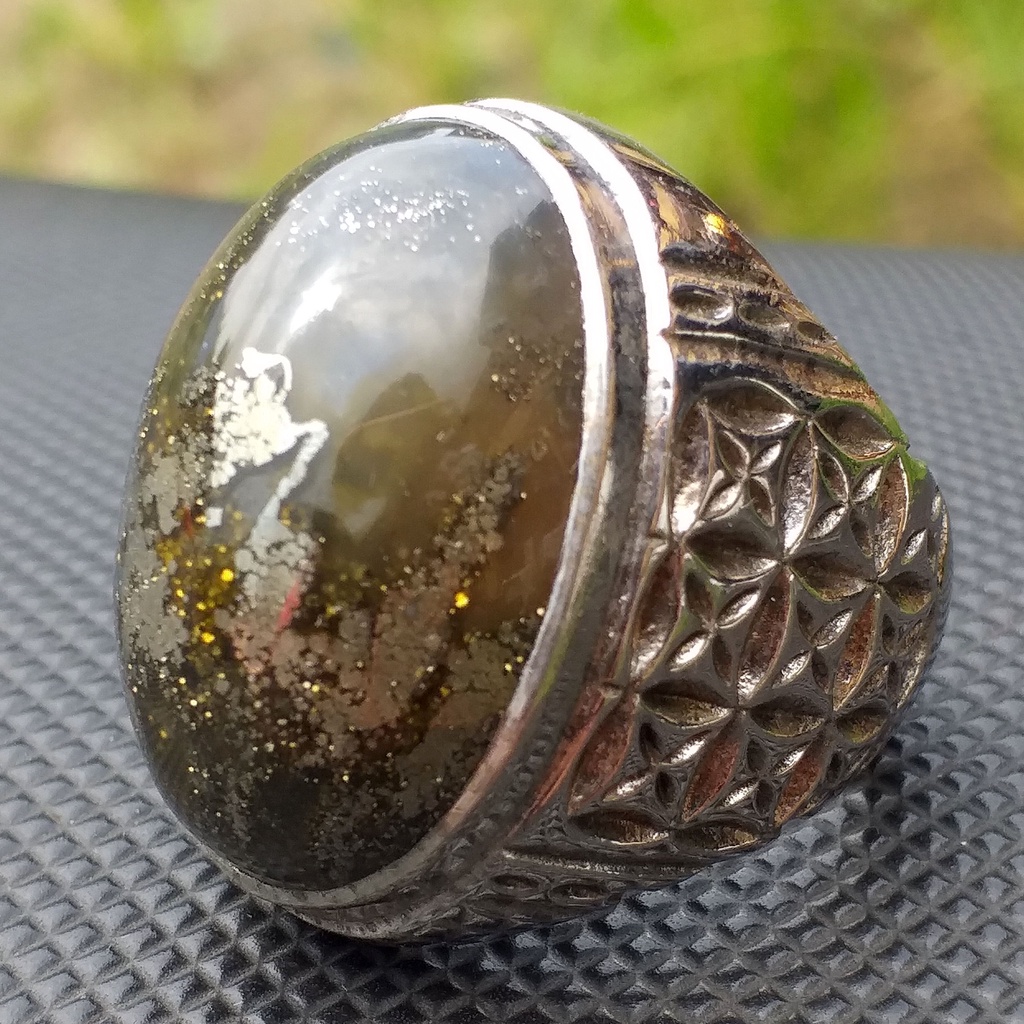 Batu Akik Unik Sigori Lafau Asli Nias Badar Perak Berkilau Dim-27 Ring Motif