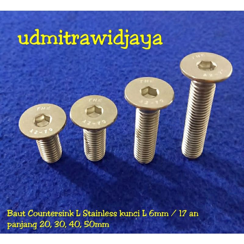 Baut Flat L baut countersink 10x20 tirus verseng L kunci 17/L 6mm panjang 20, 30, 40, 50mm stainless baut socket flat l