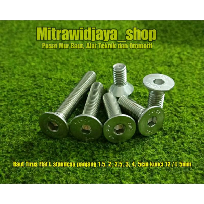 Baut Flat L baut countersink 8x16 tirus verseng L kunci 12/L 5mm panjang 16, 20, 25, 30, 40, 50mm stainless stenlis baut kode THE A2-70 original baut anti karat baut kupingan pangkon lampu cb CNC