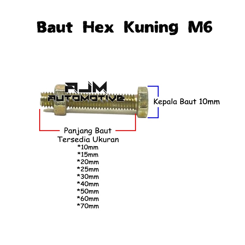 Baut Mur Hex Kuning M6 x 10 15 20 25 30 40 50 60 70 mm Hexagon Bolt