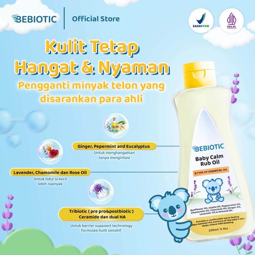 Bebiotic Baby Calm Rub Oil 100ml untuk Melindungi Bayi dari Masuk Angin dengan Lavender Peppermint Ginger Chamomile & Almond Oil Cocok Untuk Kulit Sensitif Menghangatkan dan Menenangkan