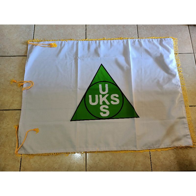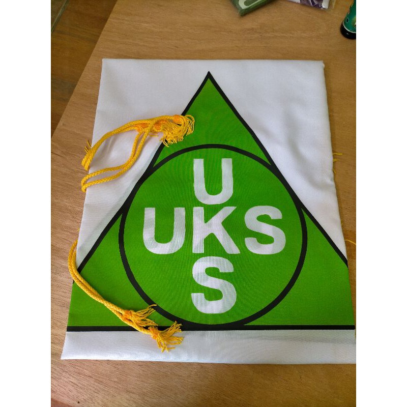 Bendera UKS tepian rumbai kuning sablon bolak balik dua sisi. bendera kesehatan. bendera segitiga hijau
