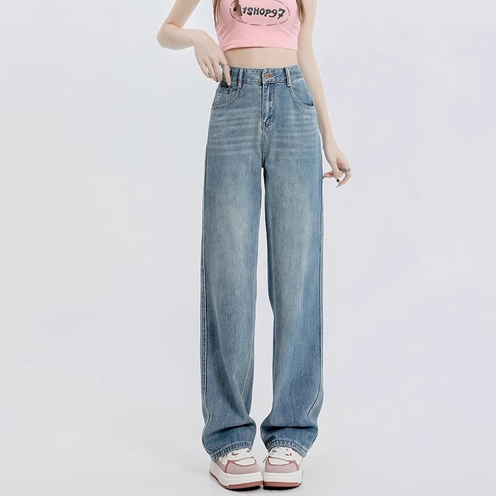Biru retro Highwaist Celana Jeans Wanita Loose Kekinian