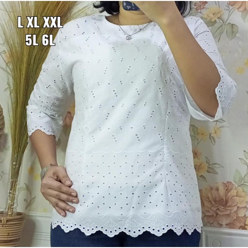 Blouse katun bolong lengan lurus warna putih/atasan blus wanita bahan katun pakai puring