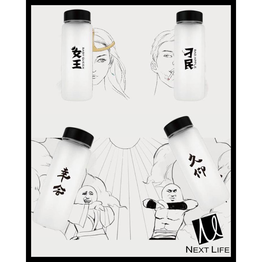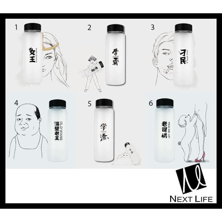 Botol Minum/Botol Minum Tulisan Mandarin / Botol Kaca / High Quality - Hitam