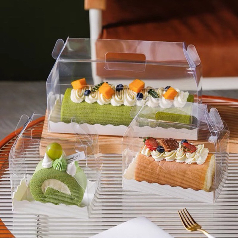 Box Mika Gable Panjang + Alas / Kemasan Tenteng Bolu Gulung Roll Cake Medium Mini / Kotak Jinjing Kue Cake Dessert / Dus Hampers Souvenir Baking Premium / Transparan Bening