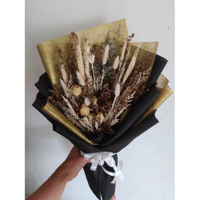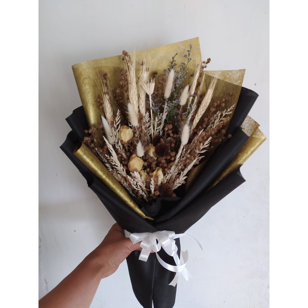 Buket Bunga Kering - Wrapp Gold Hitam - Buket Bunga Bandung - Bunga Wisuda - Bunga Valentine - Bunga Hari Ibu - Bunga Ulang Tahun
