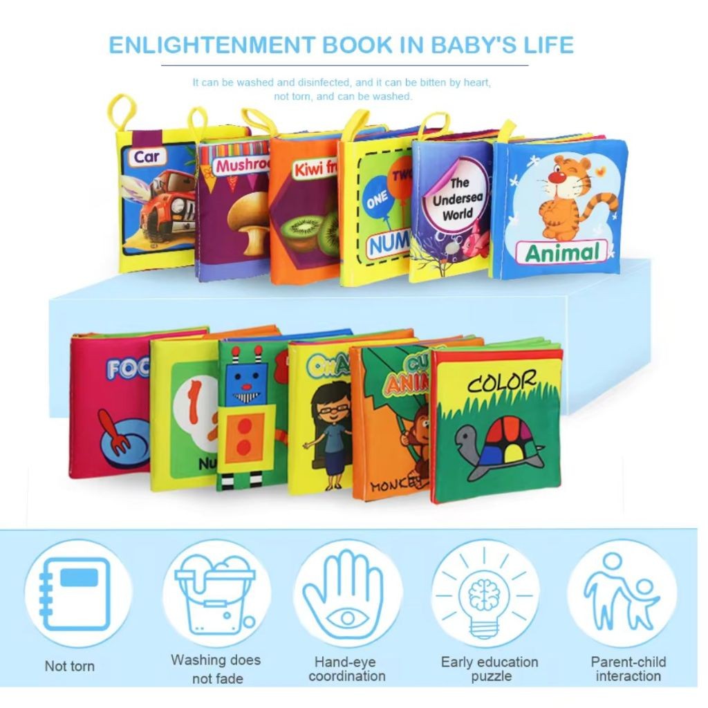 Buku Kain Edukasi Anak / Cloth Education Soft Book / Buku Bantal Mainan Edukatif Bayi Belajar Membaca Cerita Gambar 0-1 Tahun / Maenan Kresek Melatih Sensorik Motorik Balita Batita Warna Warni