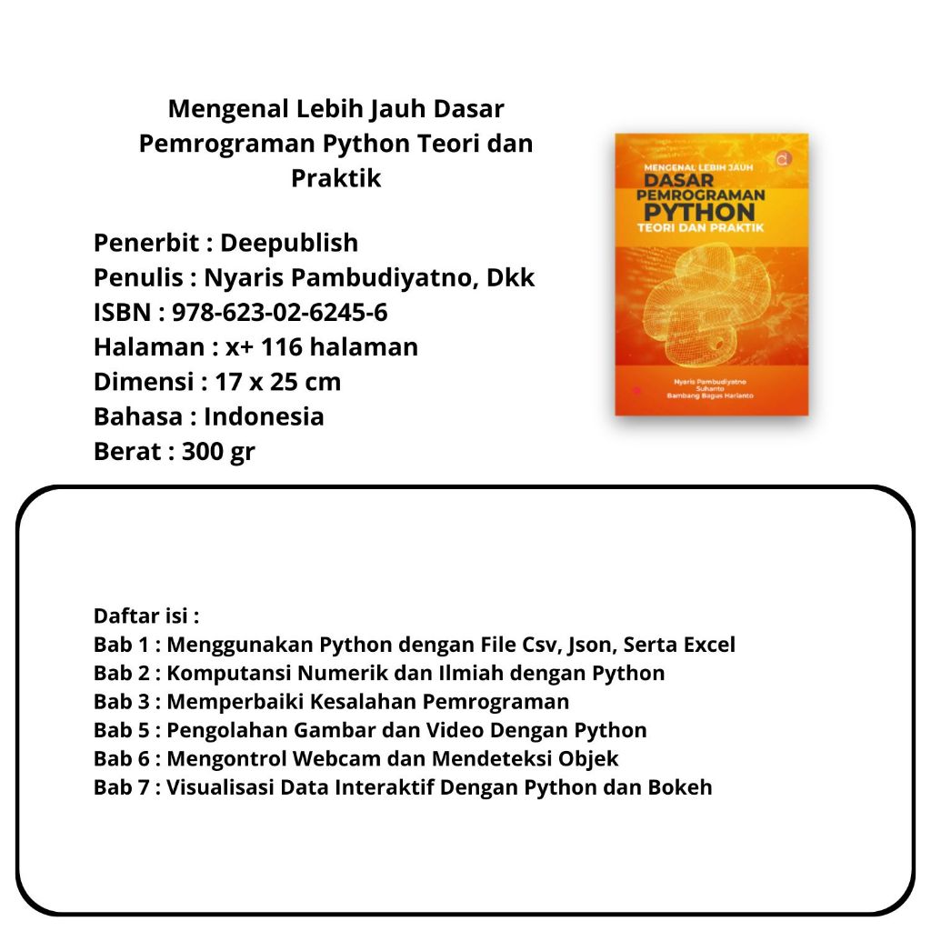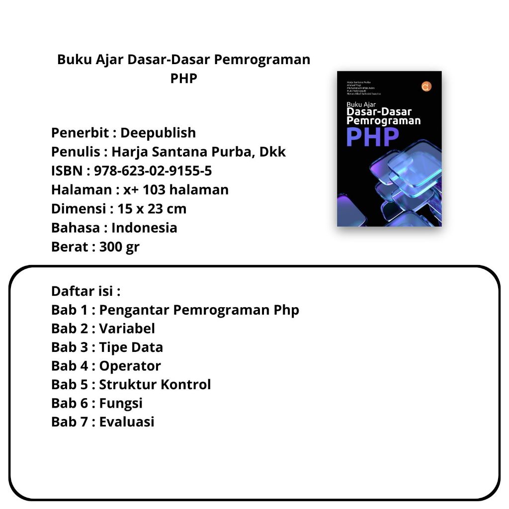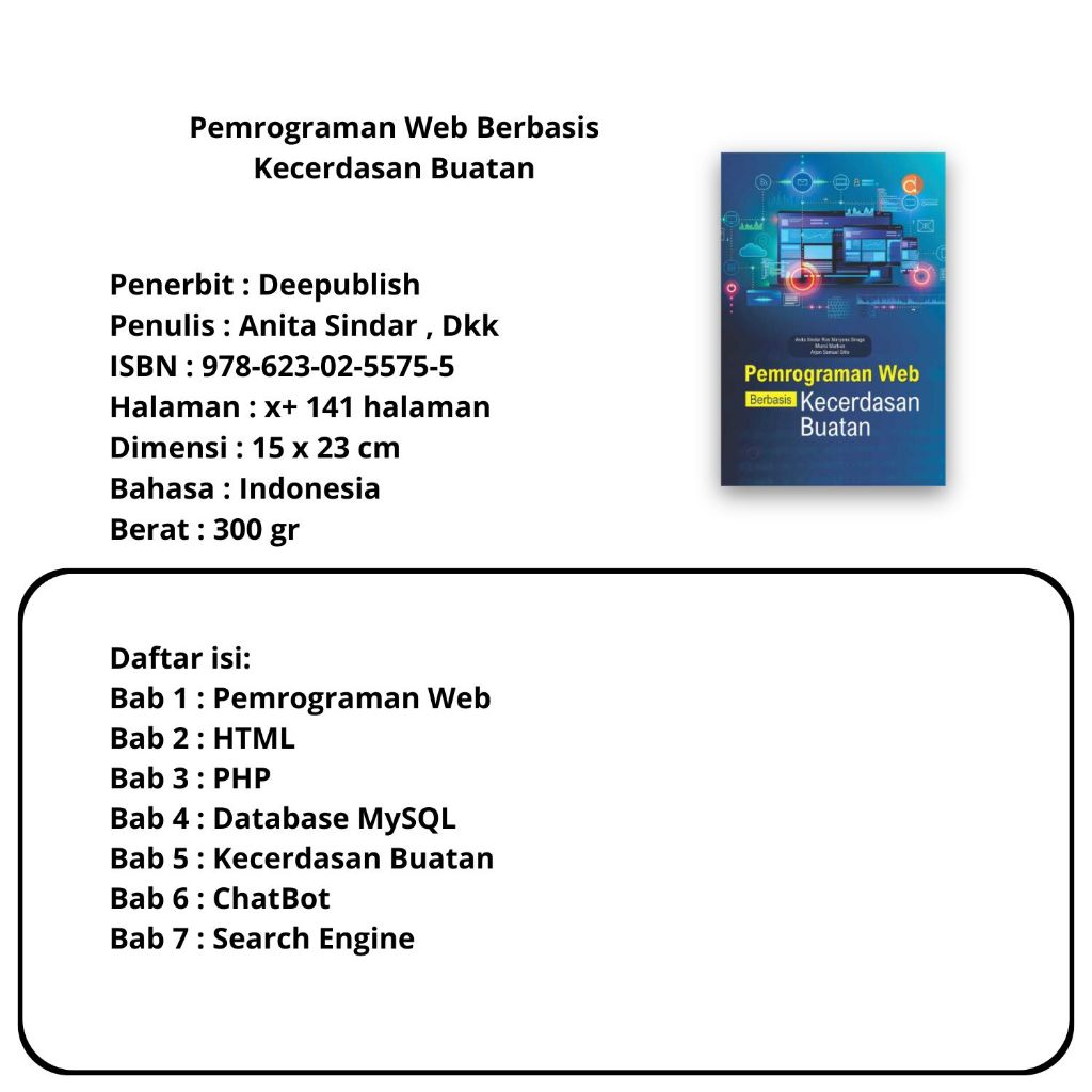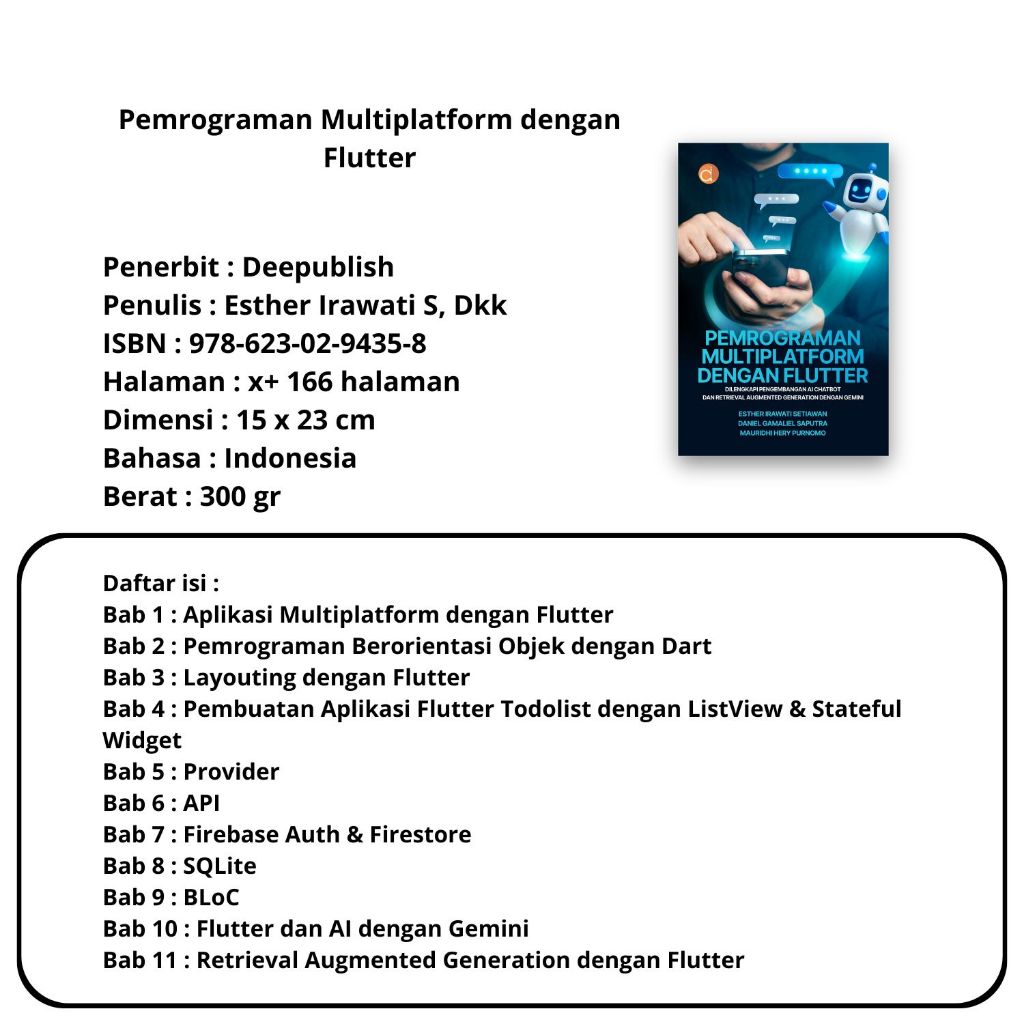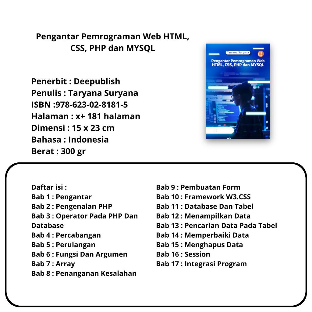 Buku Pemrograman : Aplikasi Web Berbasis PHP dan SQLite,Pemrograman Python Teori dan Praktik,Pengantar Pemrograman Web HTML, CSS, PHP dan MYSQL,Kecerdasan Buatan,Berbasis Fungsi,,Multiplatform dengan Flutter,Pemrograman PHP- Deepublish