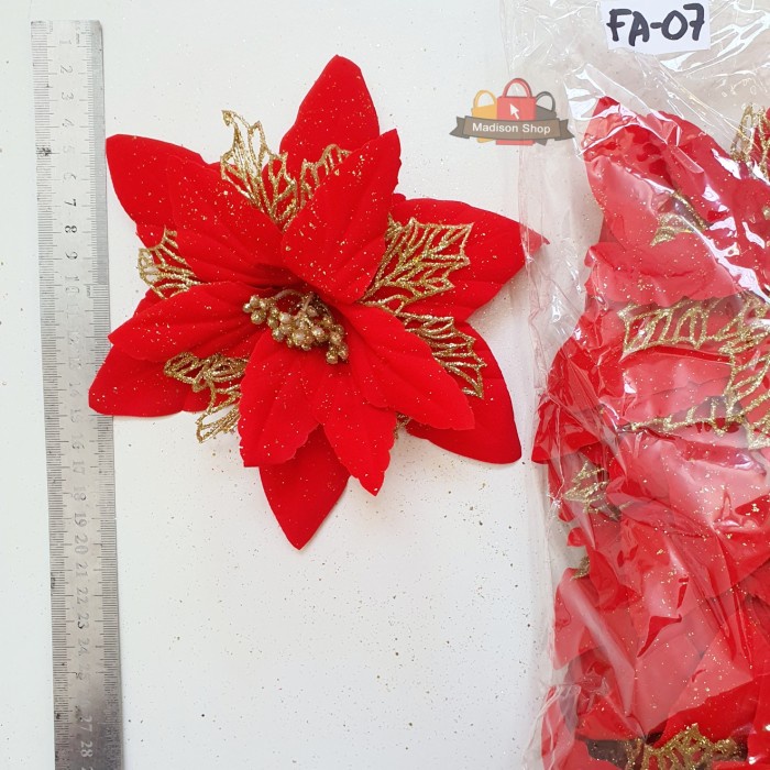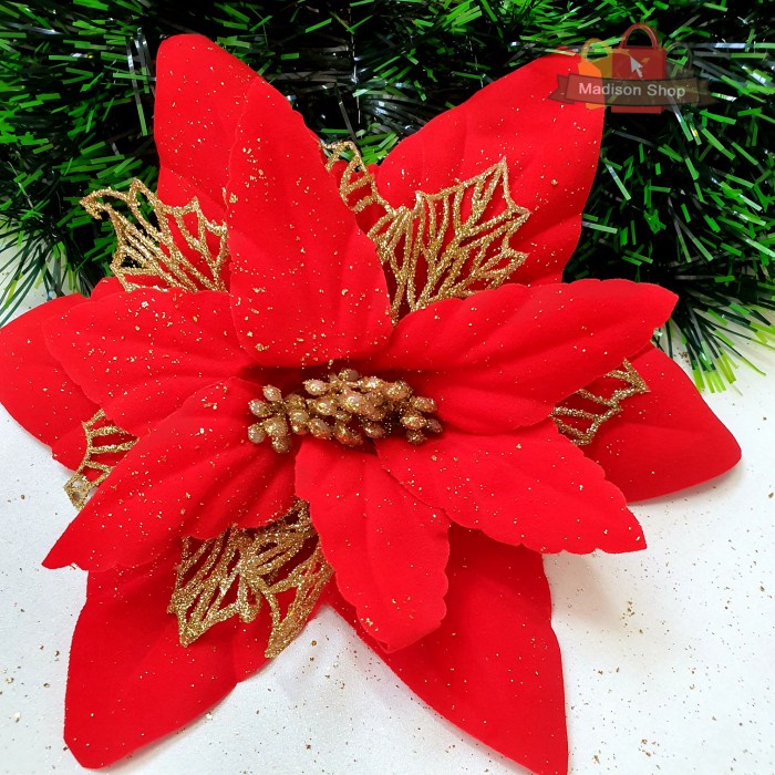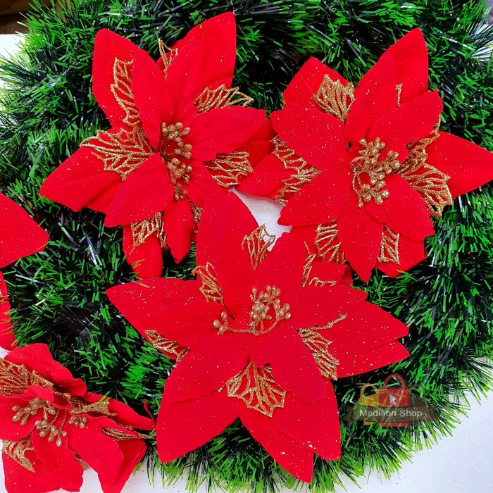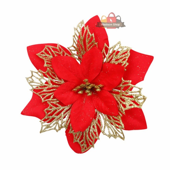 Bunga Natal Merah Kombinasi Emas Hiasan Parcel Dekorasi Pohon Natal - TANGKAI BESAR