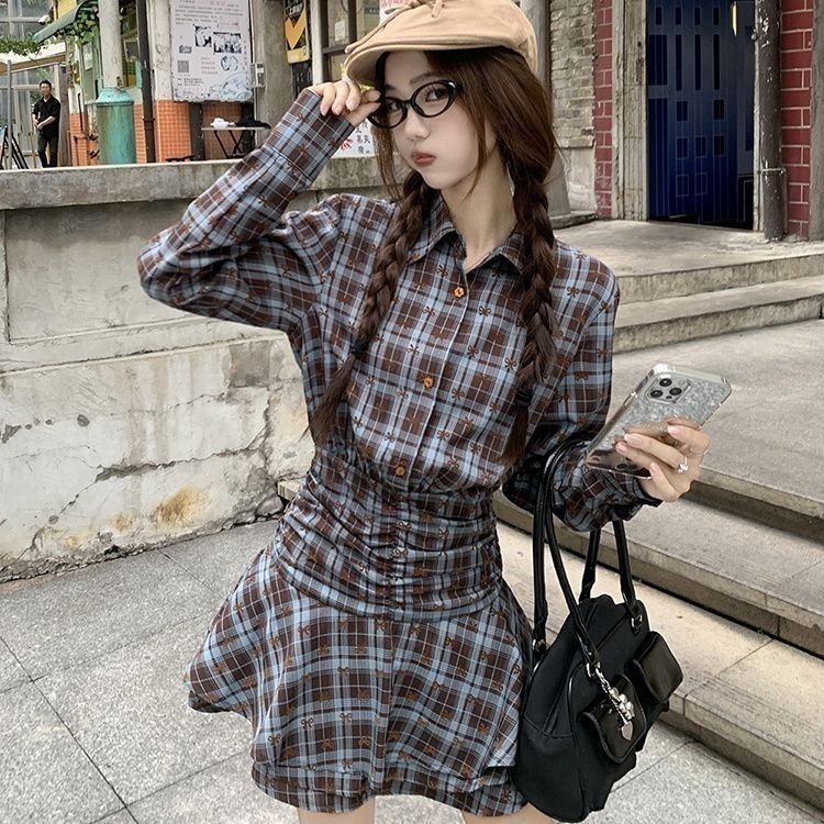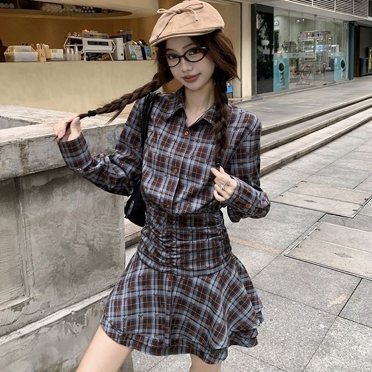 Busur Periksa Kemeja Polo Gaun Longsor Panjang 2025 Musim Semi Kue Rok Pendek Helping Pinggang Berg
