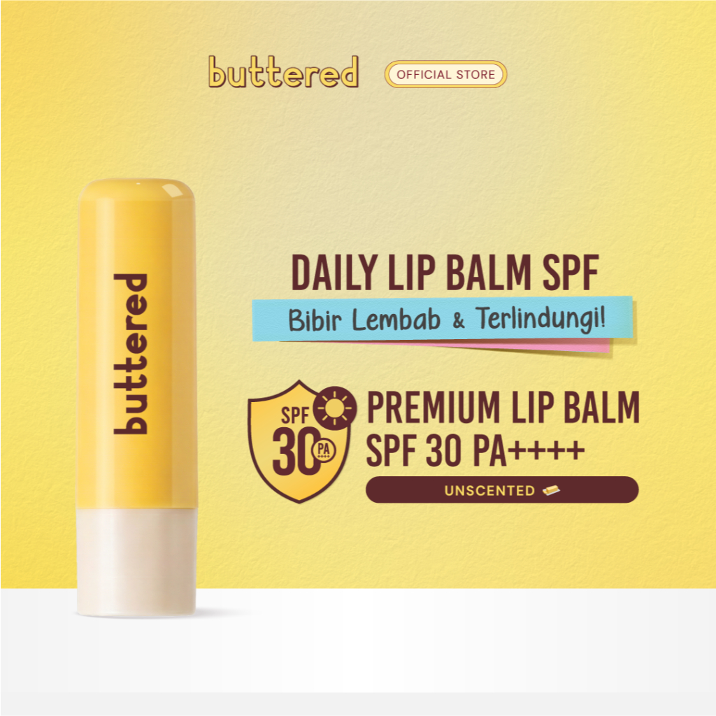 Buttered Premium Lip Balm Harian SPF 30 PA++++ Daily Lip Balm untuk Pemakaian Harian dengan Broad Spectrum UVA UVB Melembapkan Hingga 16 Jam Perawatan Bibir Kering Lipbalm Ringan Tidak Lengket dan Nyaman Dipakai Sehari-hari