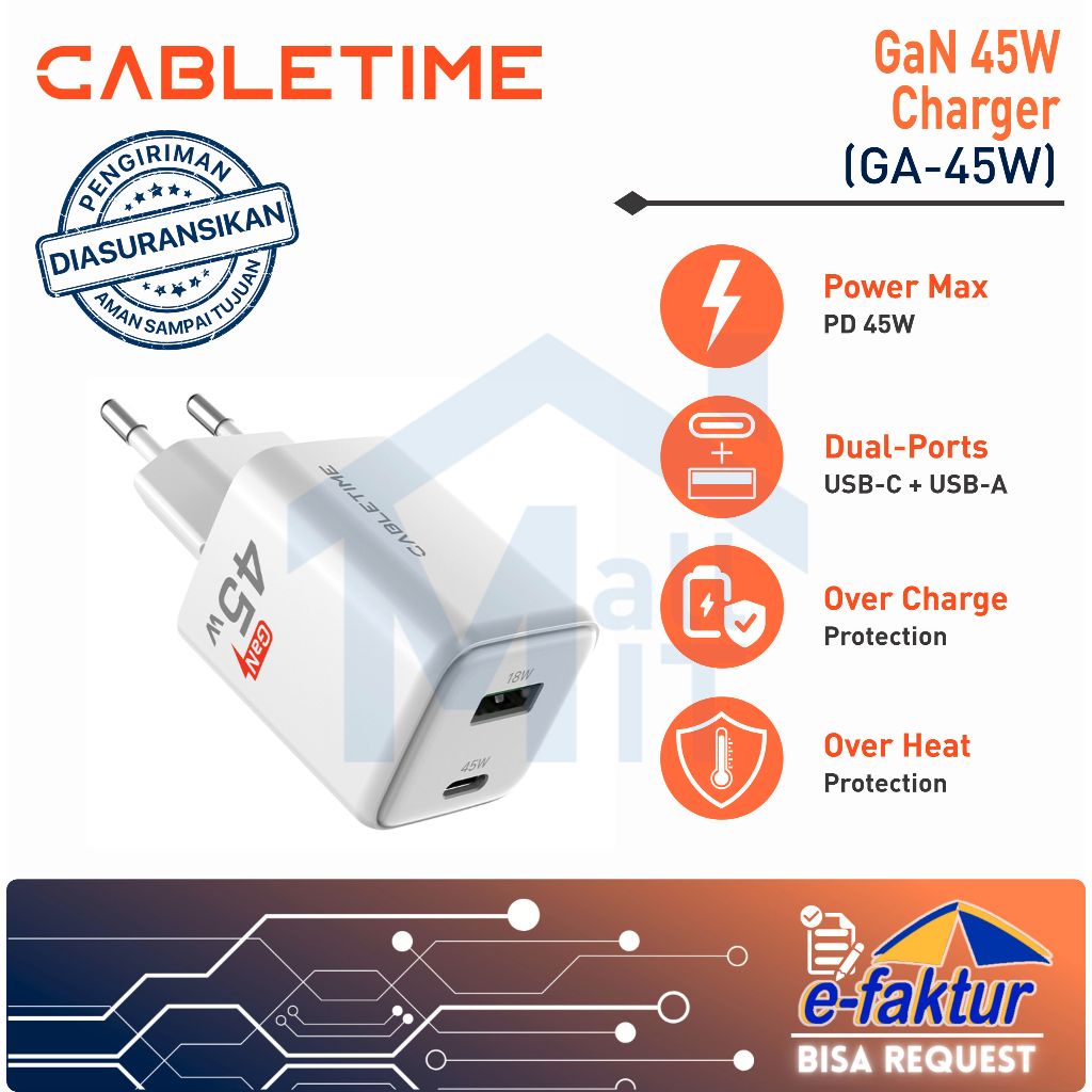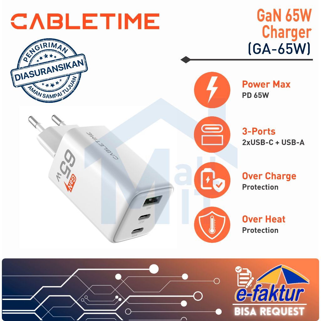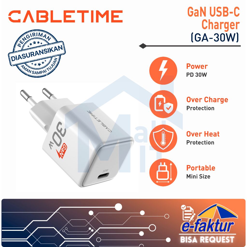 MALLIT CABLETIME Adaptor Kepala Charger GaN PD USB-C Type C Fast Charging 20W 30W 45W 65W GA20B GA30W GA45W GA65W