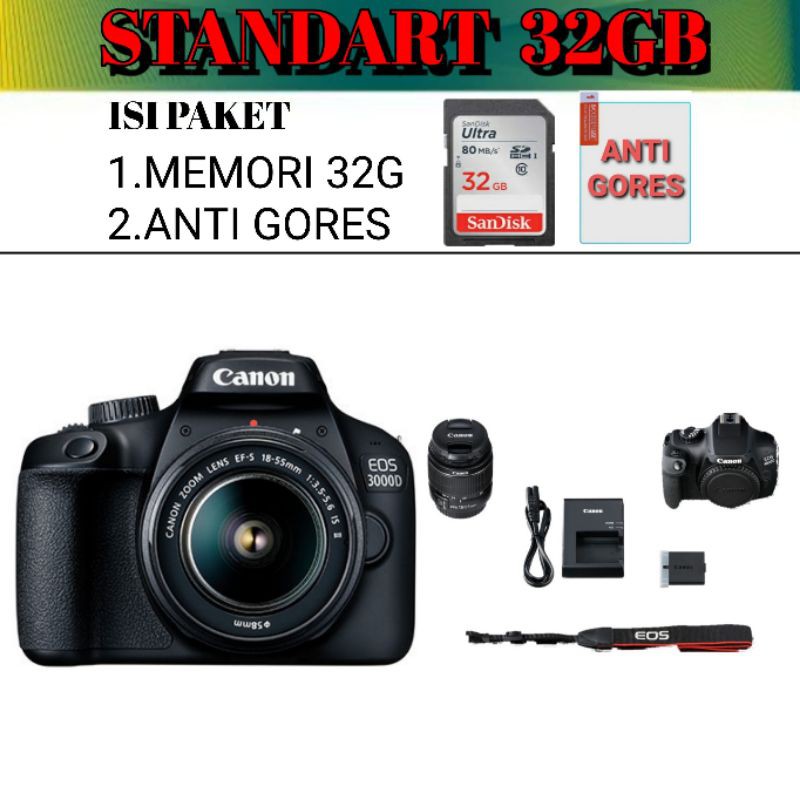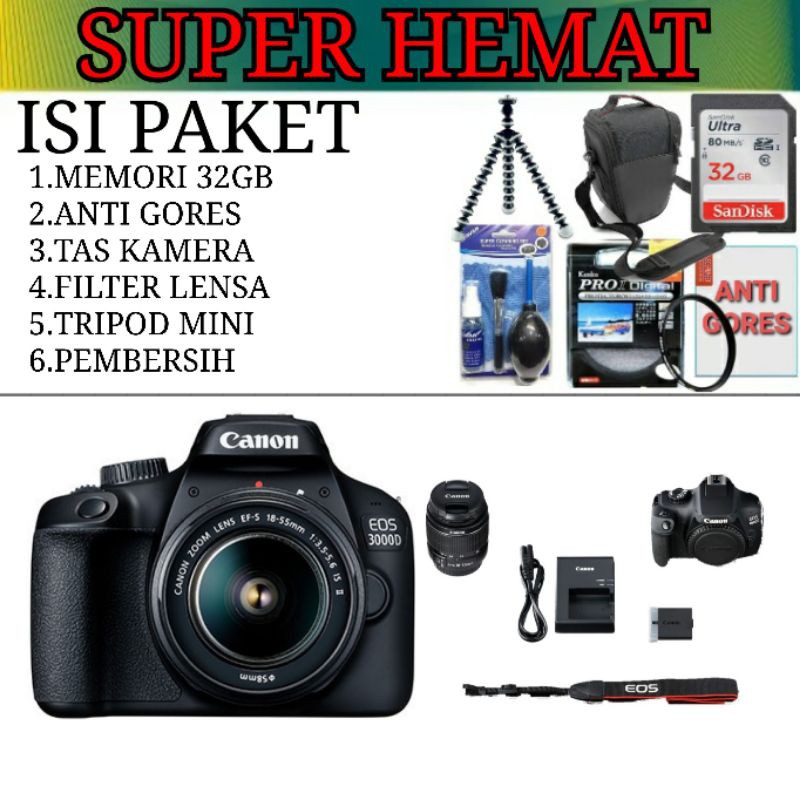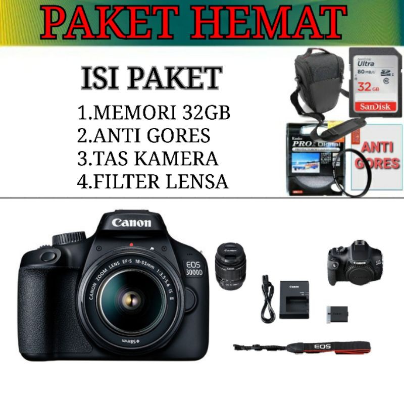 CANON EOS 3000D + LENSA 18-55MM III ( BERGARANSI 1 TAHUN ) PRODUK 100% ORIGINAL DAN BARU