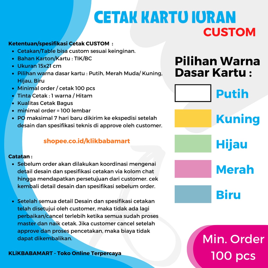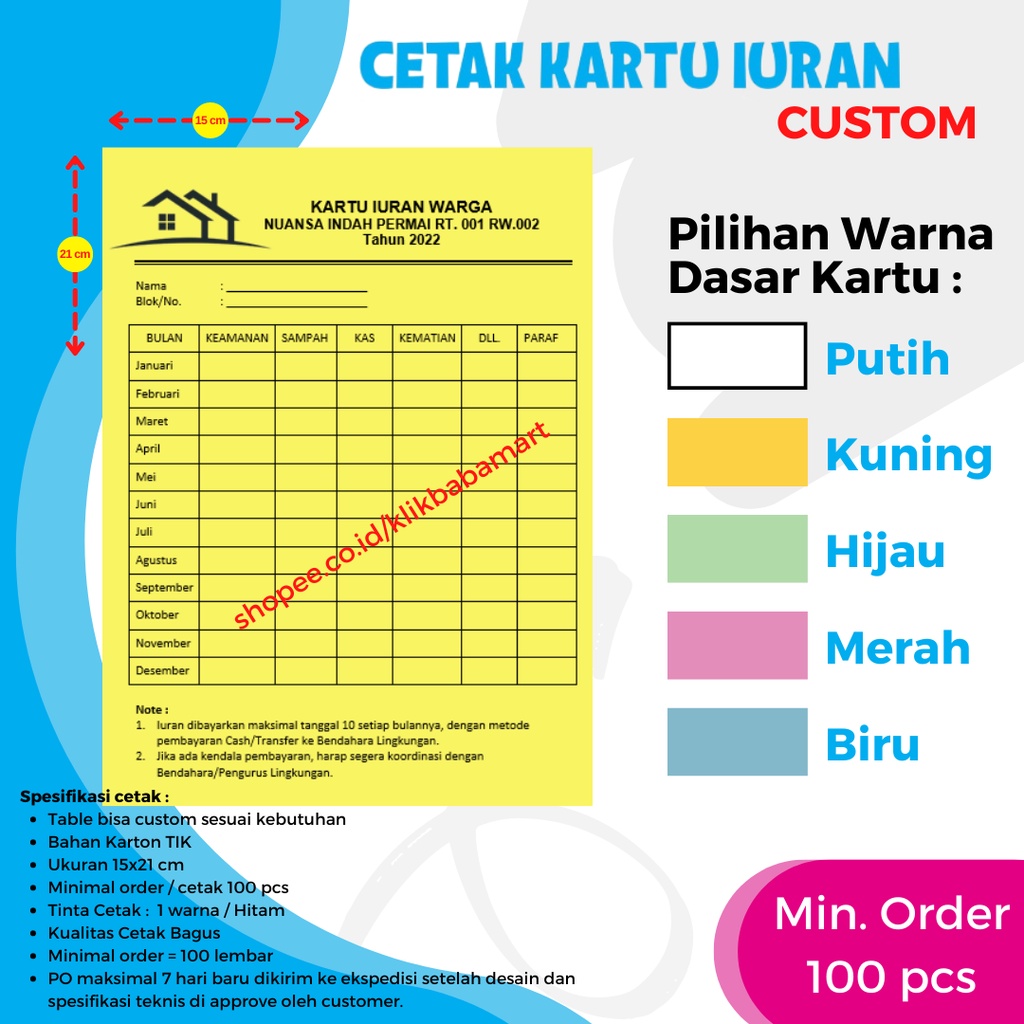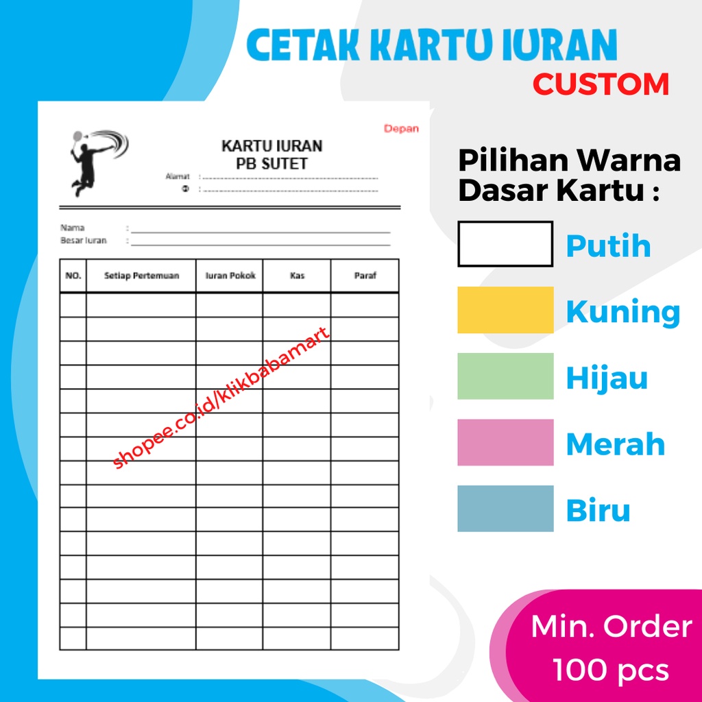 CETAK KARTU IURAN WARGA / SPP SEKOLAH BAYARAN / KARTU STOK REKAM MEDIK / KOMUNITAS / DLL. UKURAN 1/2 A4 ISI 100 PCS