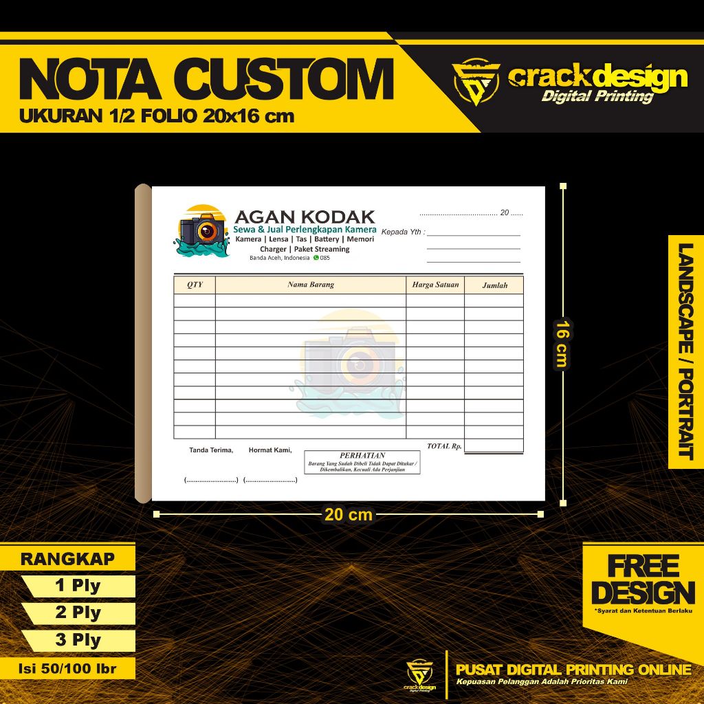 CETAK NOTA CUSTOM UKURAN 1/2 FOLIO ISI 50 DAN 100 LEMBAR GROSIR CUSTOM TOKO / NOTA OLSHOP / NOTA BON / KWITANSI / INVOICE / SURAT JALAN /FORMULIR / MURAH FULL COLOR ANTI AIR 1 HARI LANGSUNG JADI CRACKDESIGN
